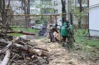 Упавшие ветви и деревья, в первую очередь, убирают с проезжей части, с общественных территорий и во дворах, распиливают стволы, убирают и вывозят ветки.