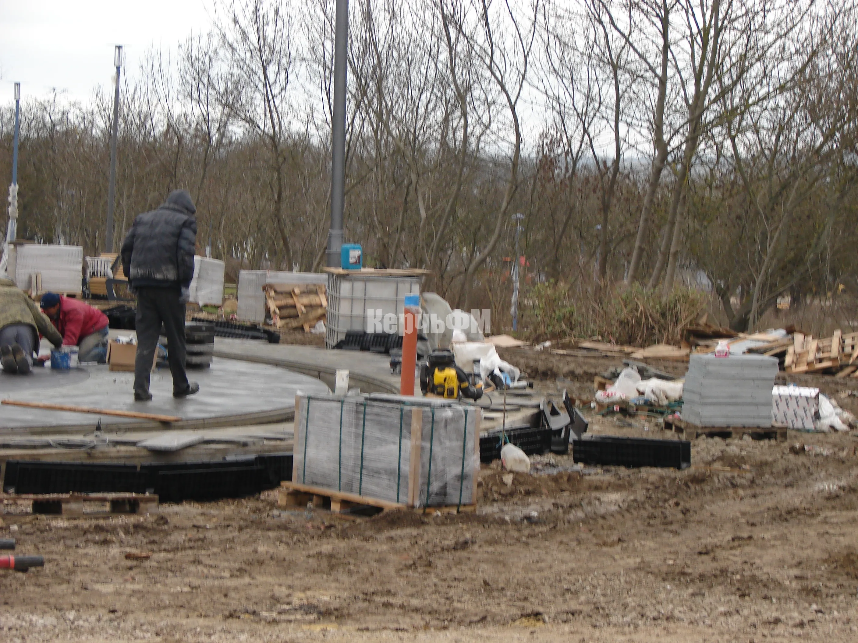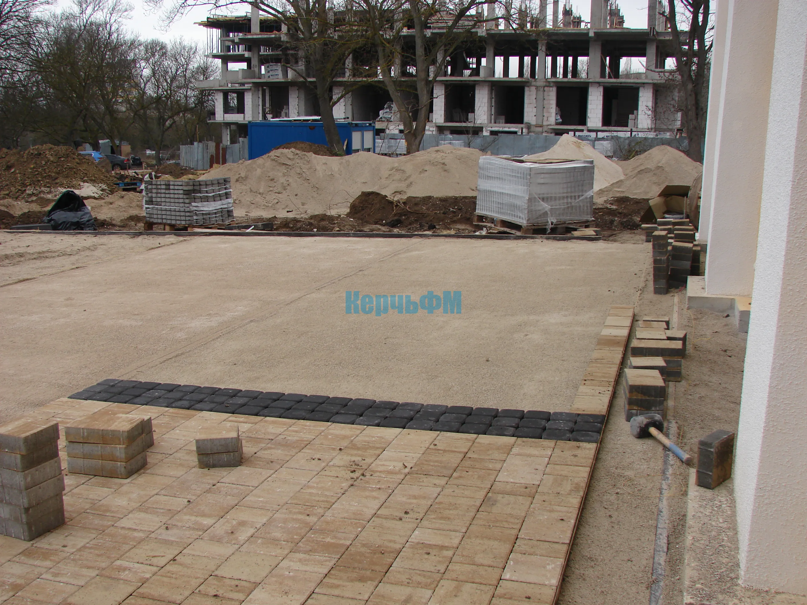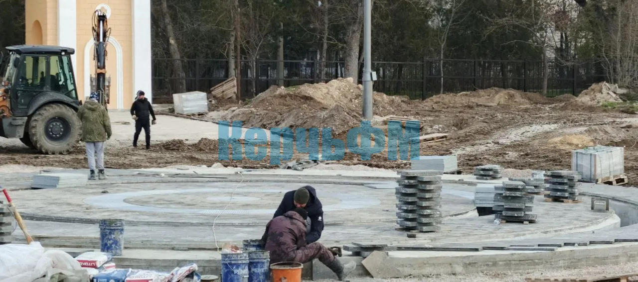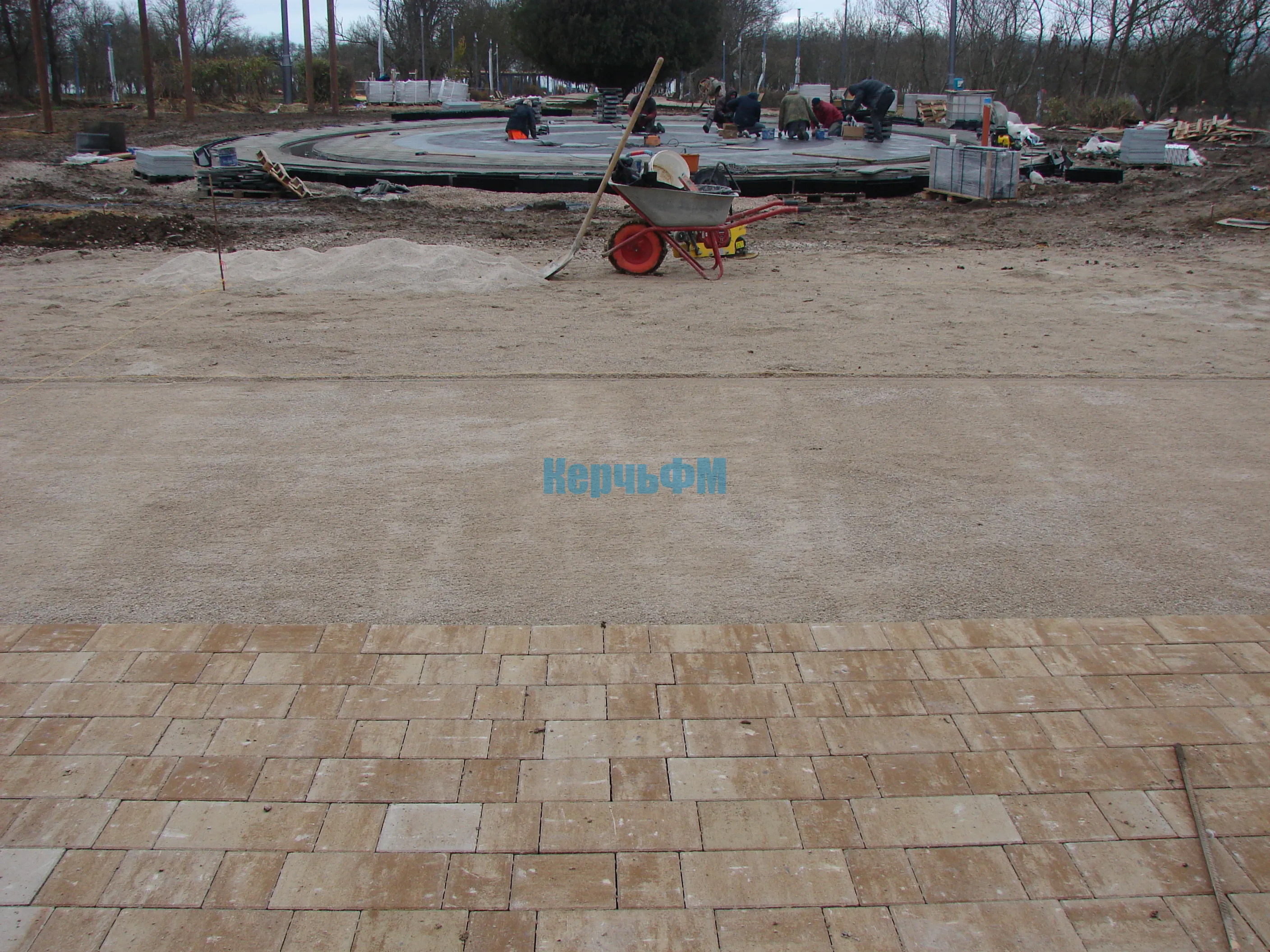Рабочие продолжают укладку тротуарной плитки между фонтаном и центральным входом, передает КерчьФМ.