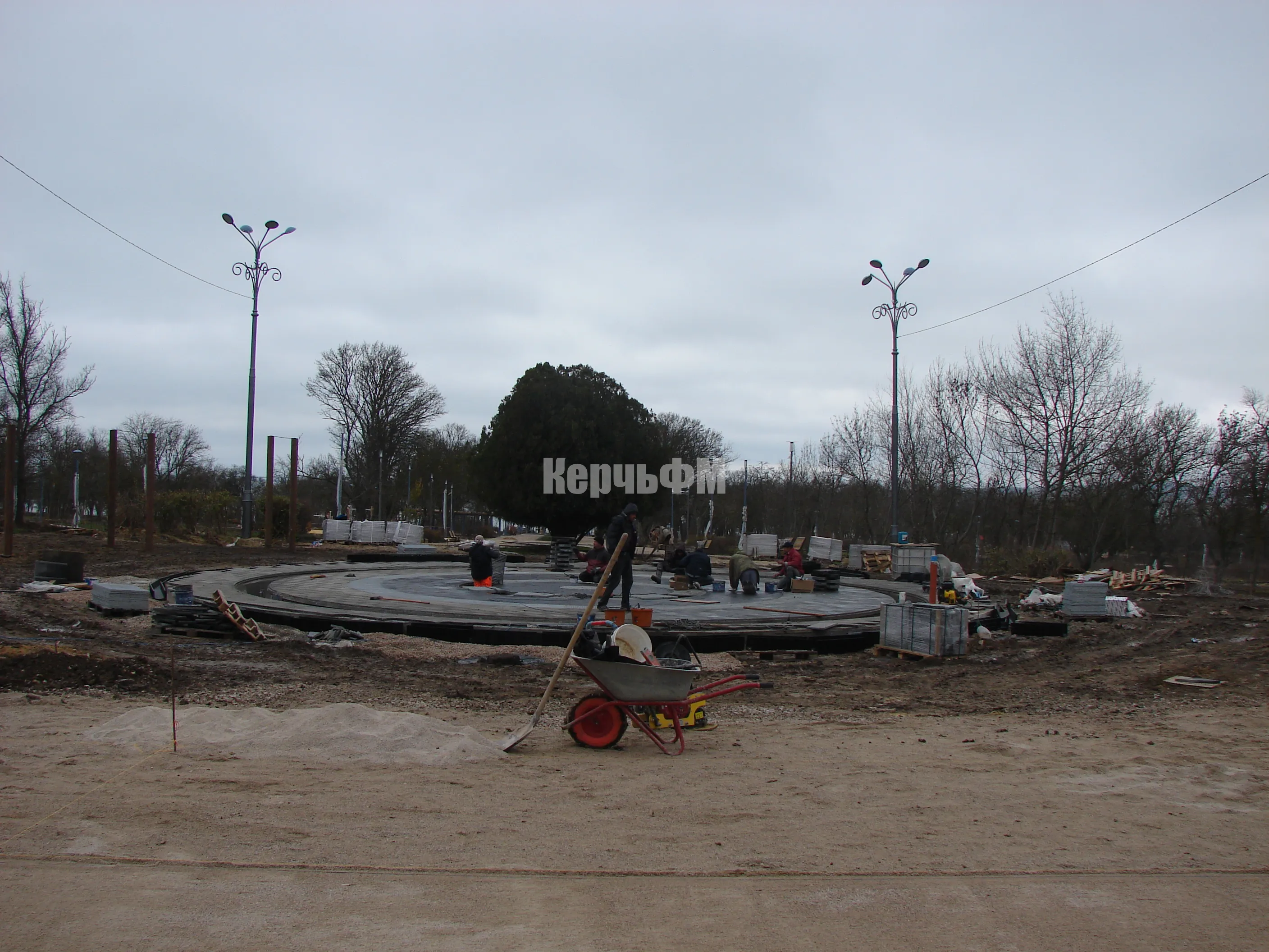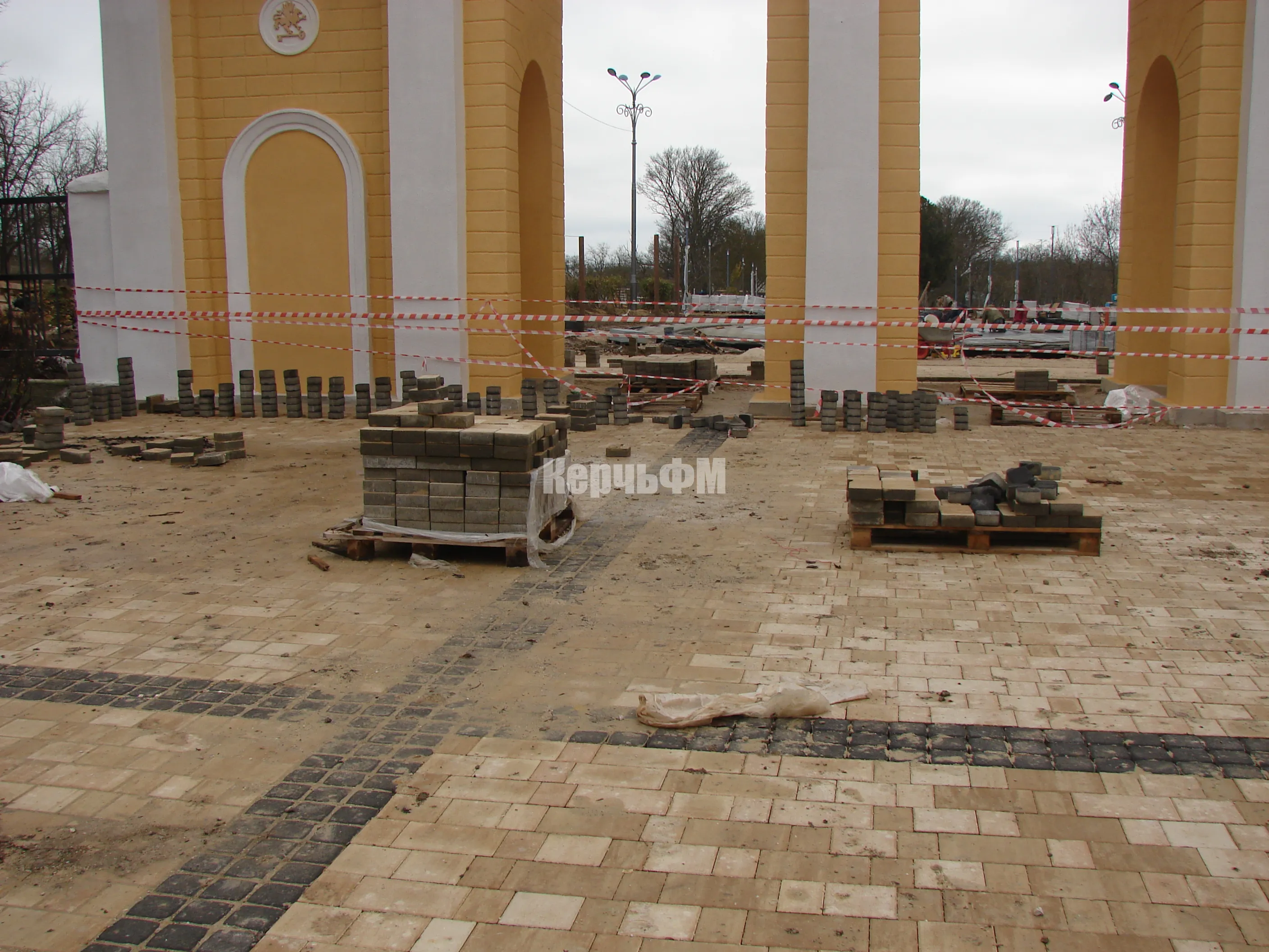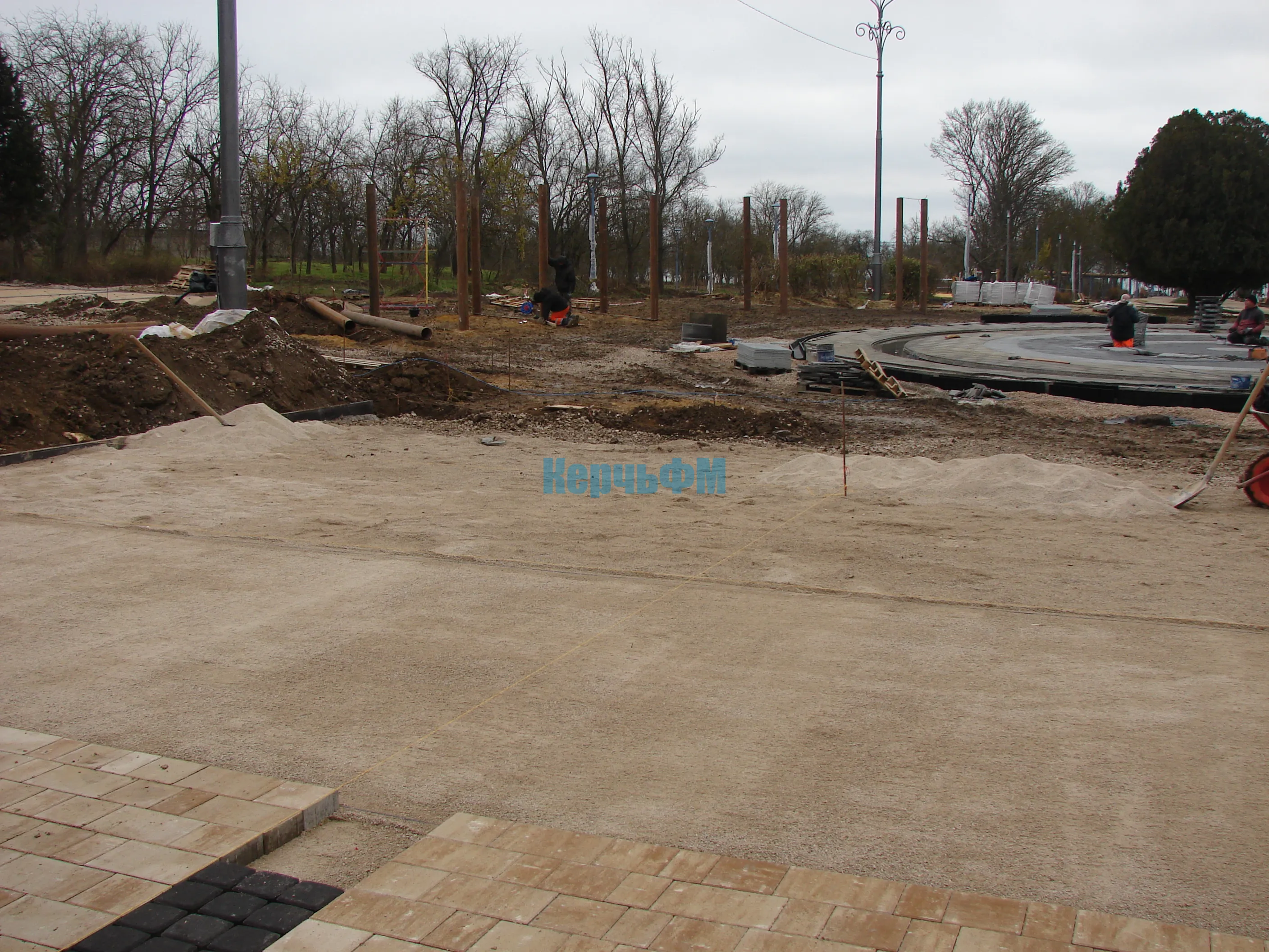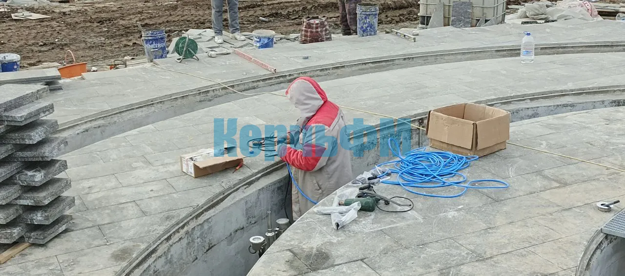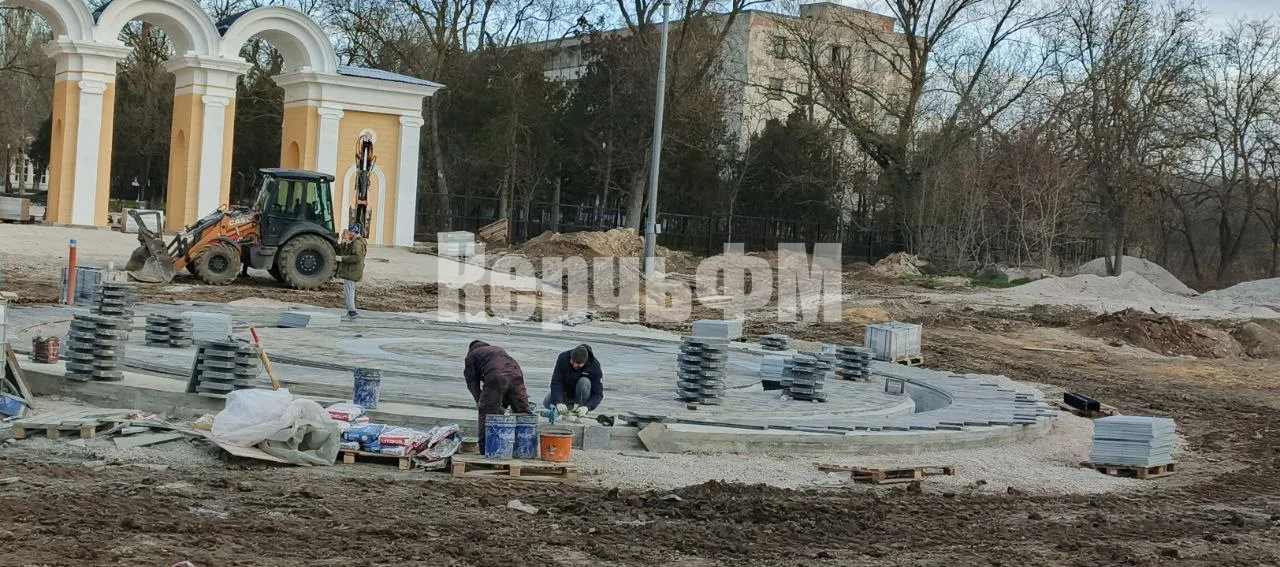 Рабочие продолжают укладку тротуарной плитки между фонтаном и центральным входом, передает КерчьФМ.
