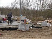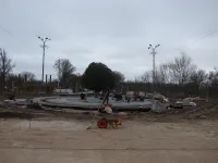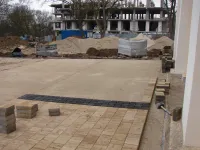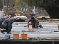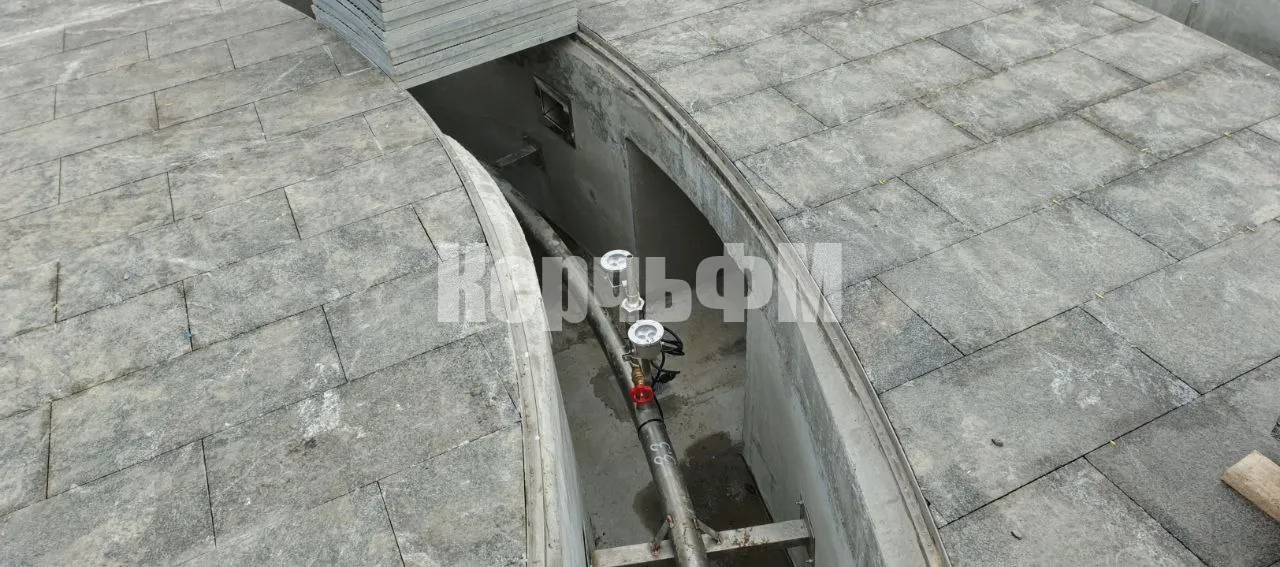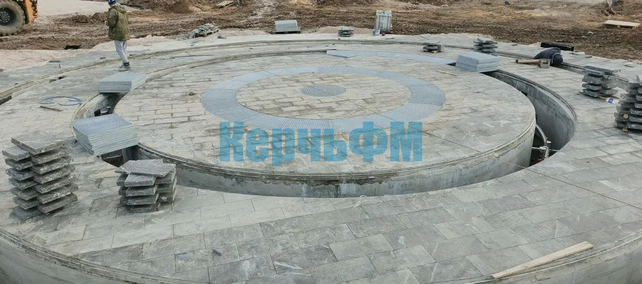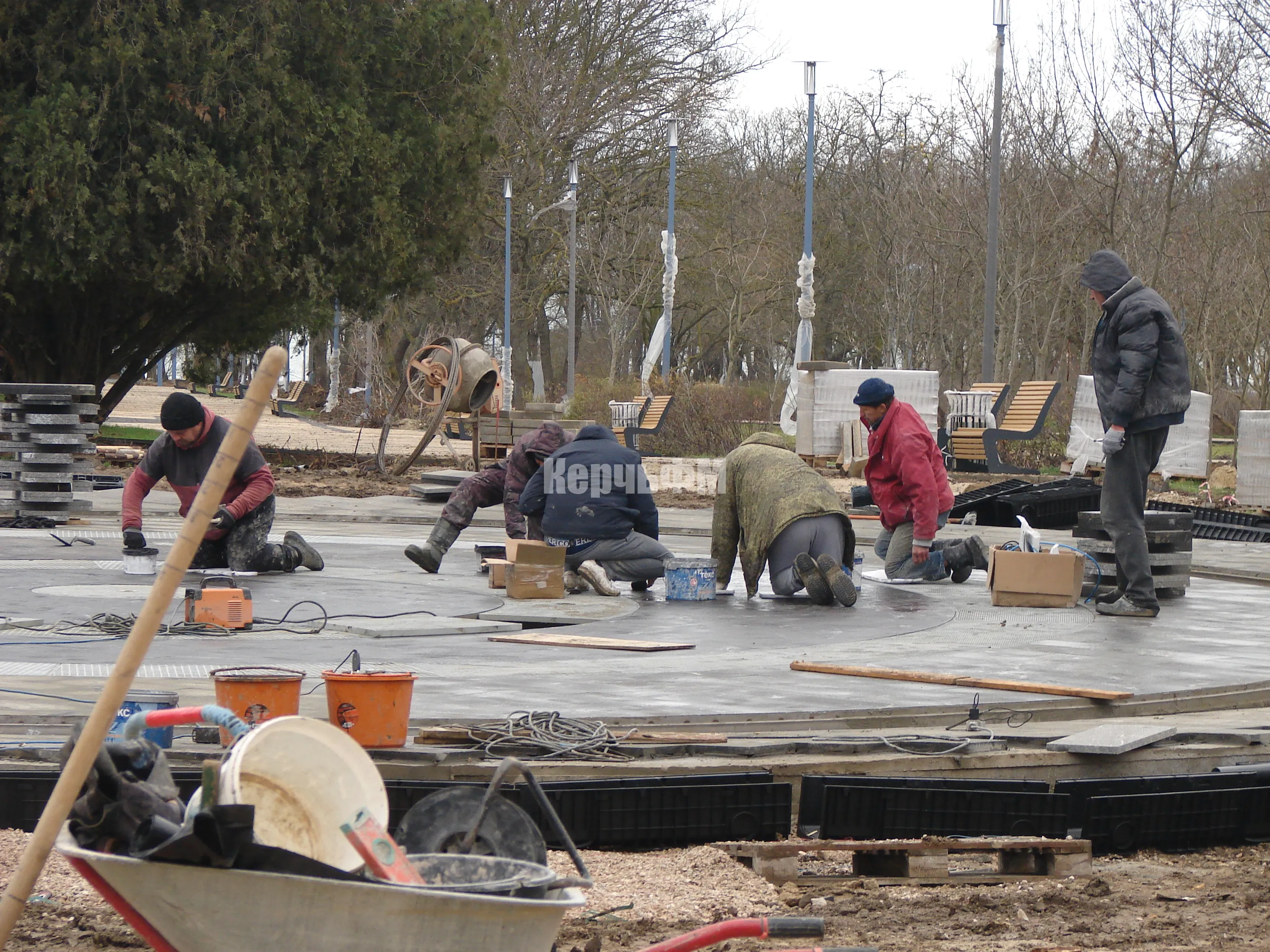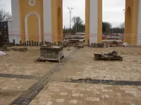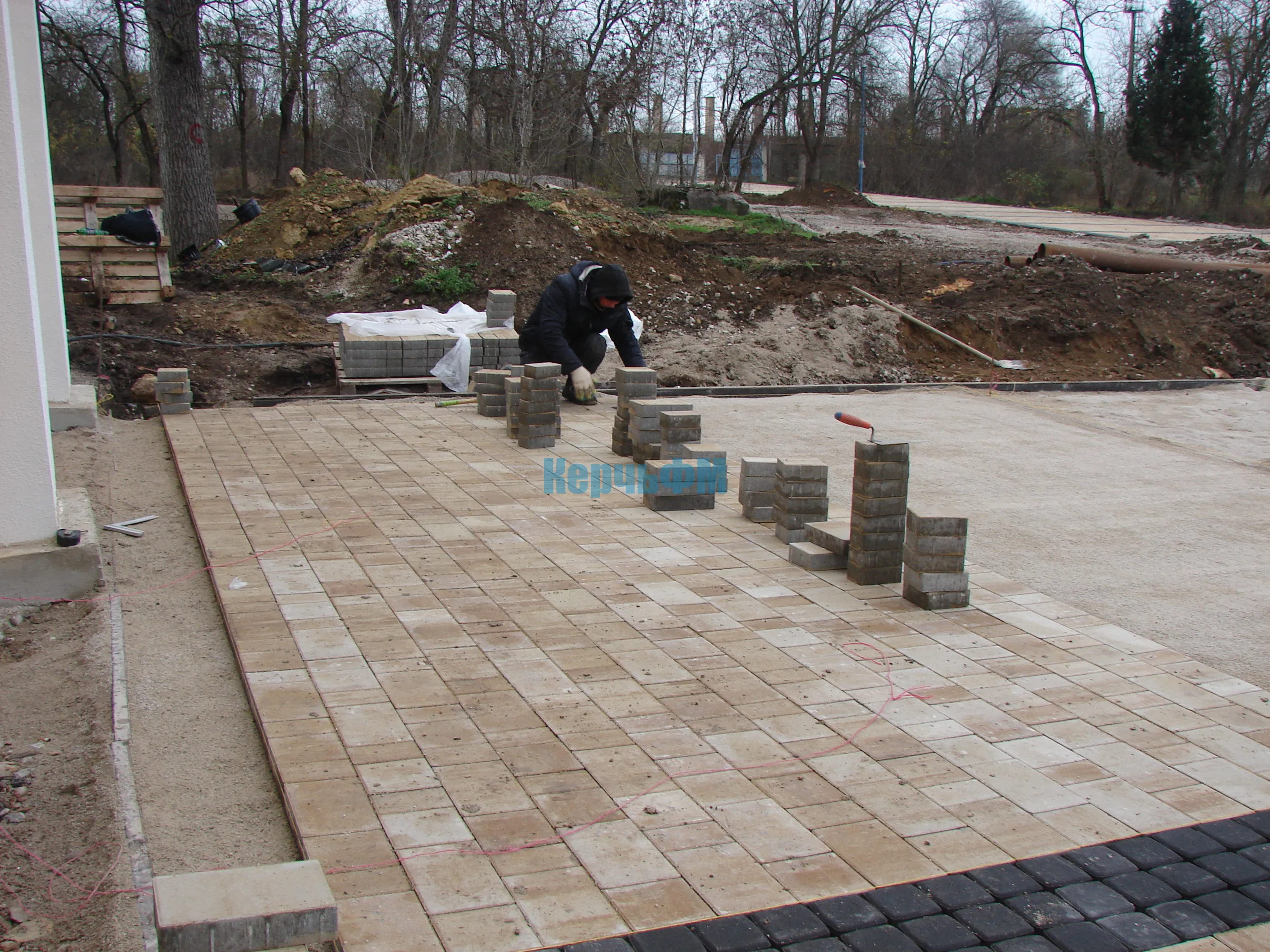 Рабочие продолжают укладку тротуарной плитки между фонтаном и центральным входом, передает КерчьФМ.