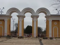 Входная арка в парк сияет новизной и красками, выполненными в светлых тонах.