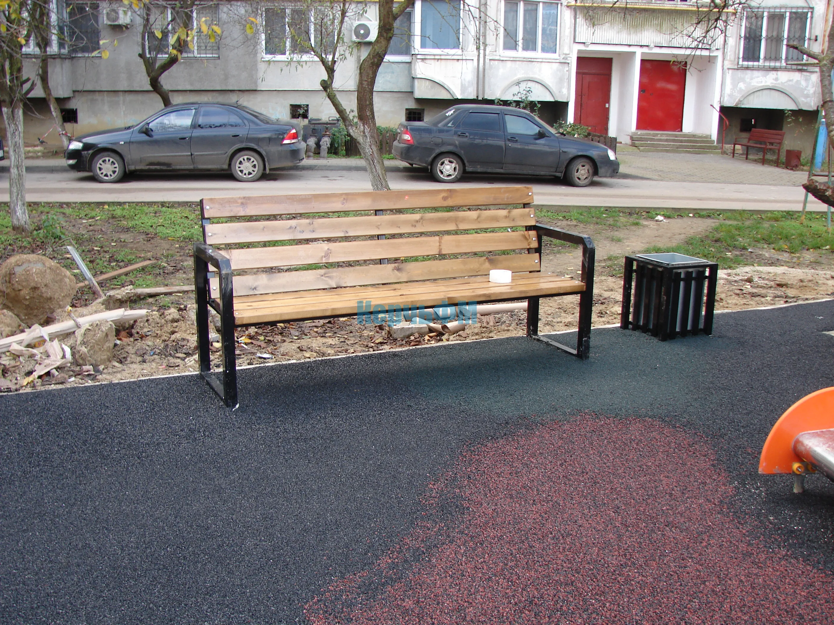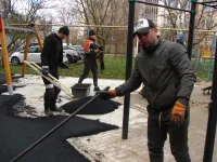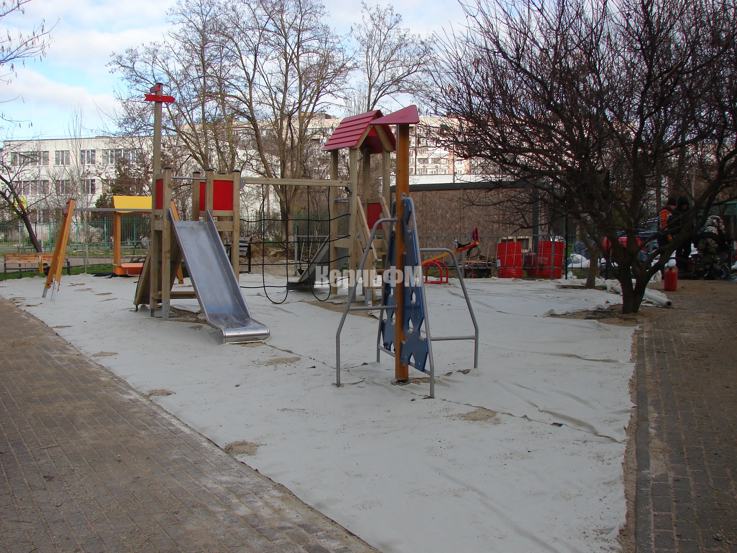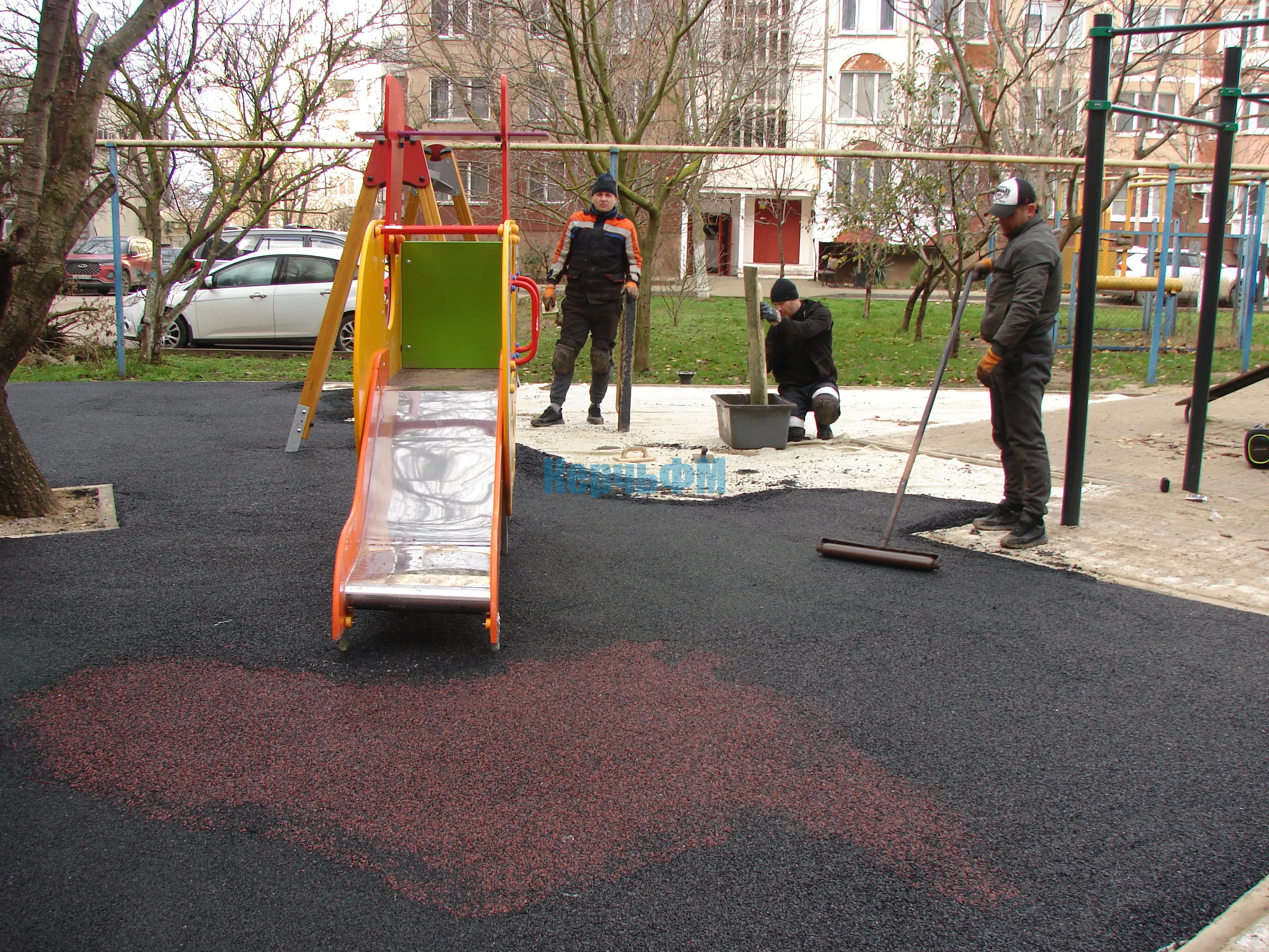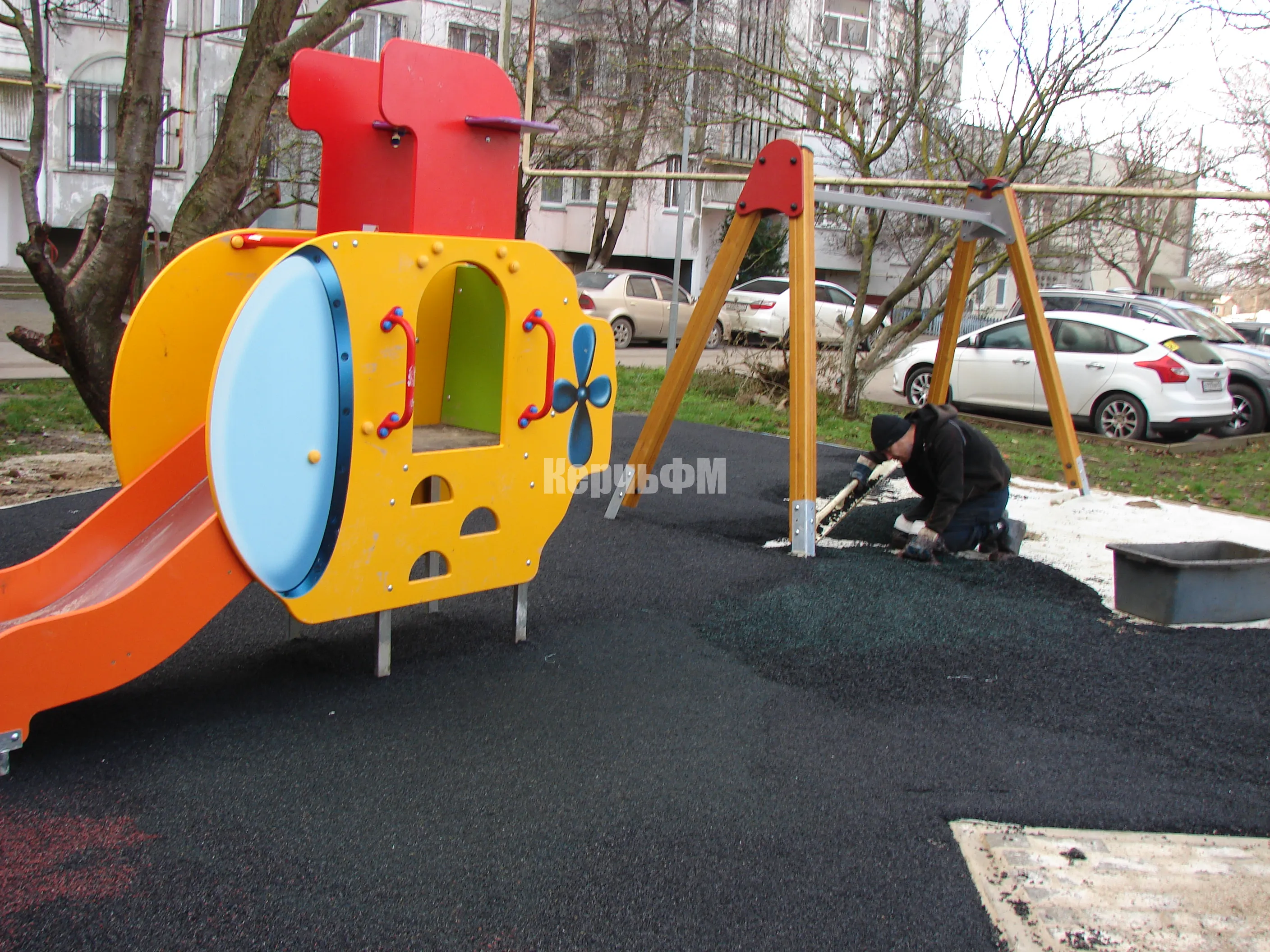 На детской площадке, обновления которой дети так ждали, установили игровые элементы и сегодня начали укладывать резиновое бесшовное покрытие.