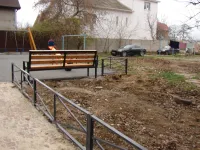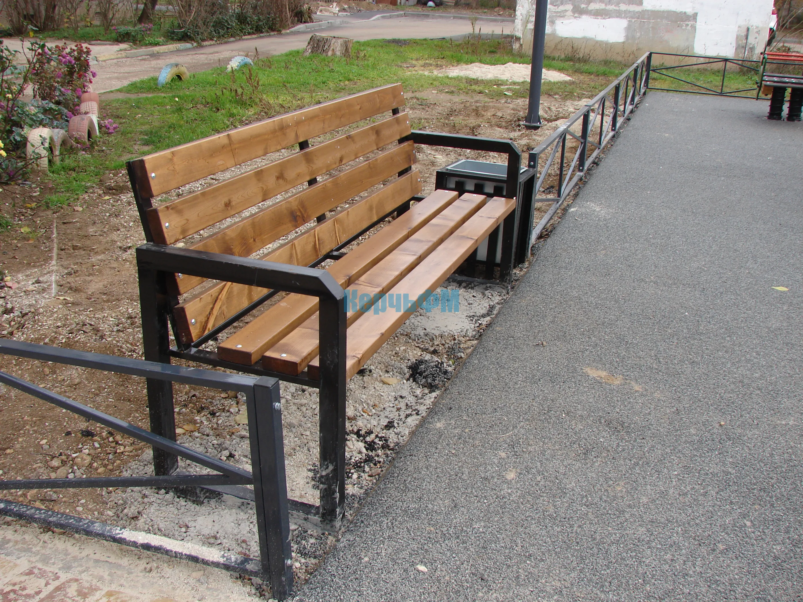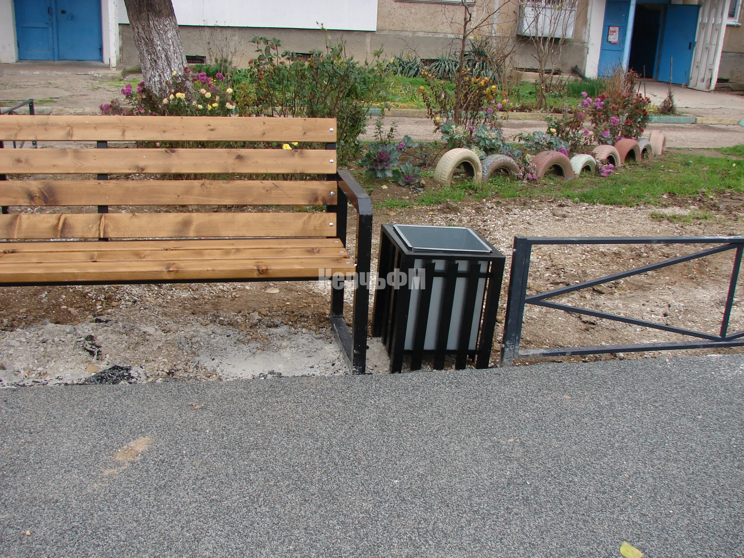 Площадку сделали, установили лавочку, возле нее поставили мусорную урну. Лавочка стоит на земле, урна перекошена.