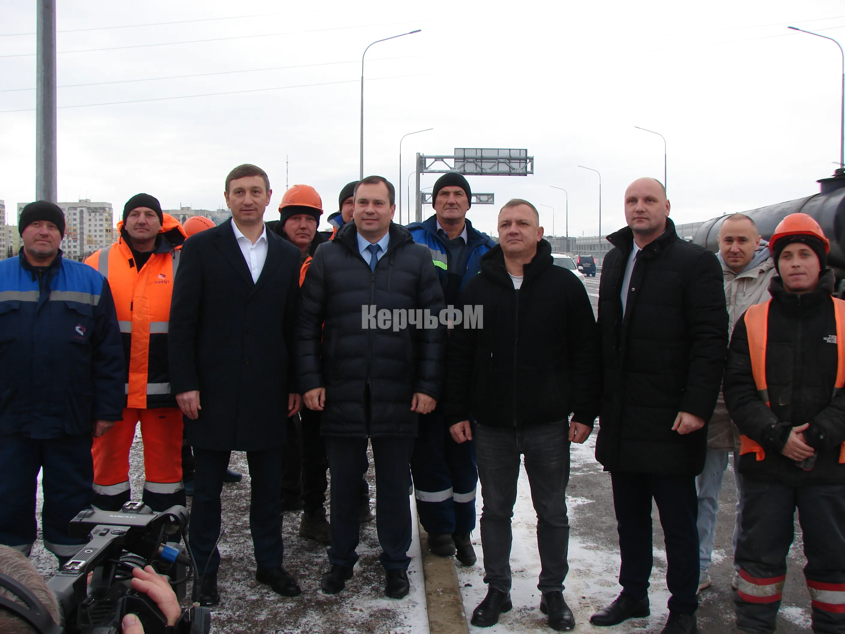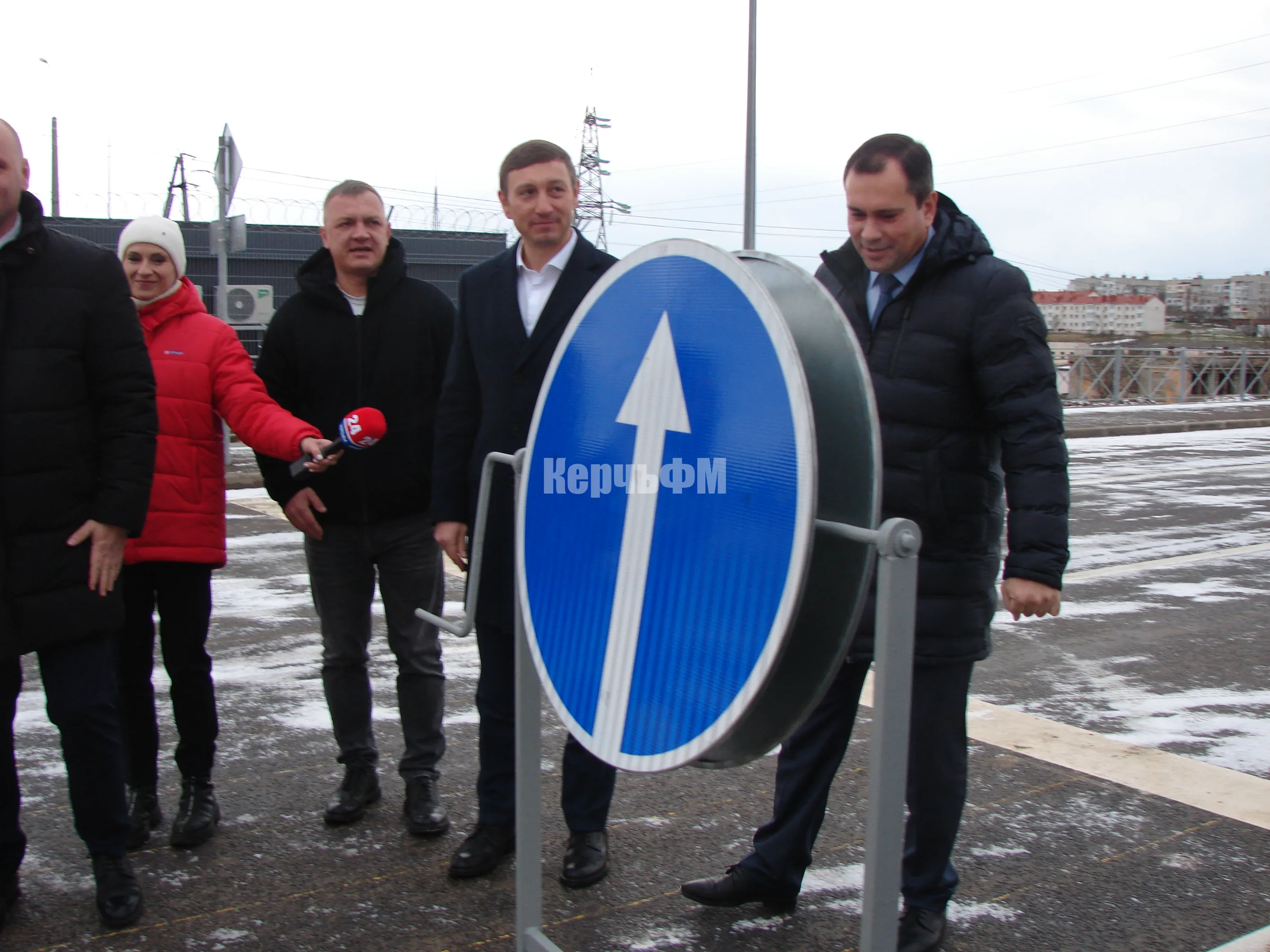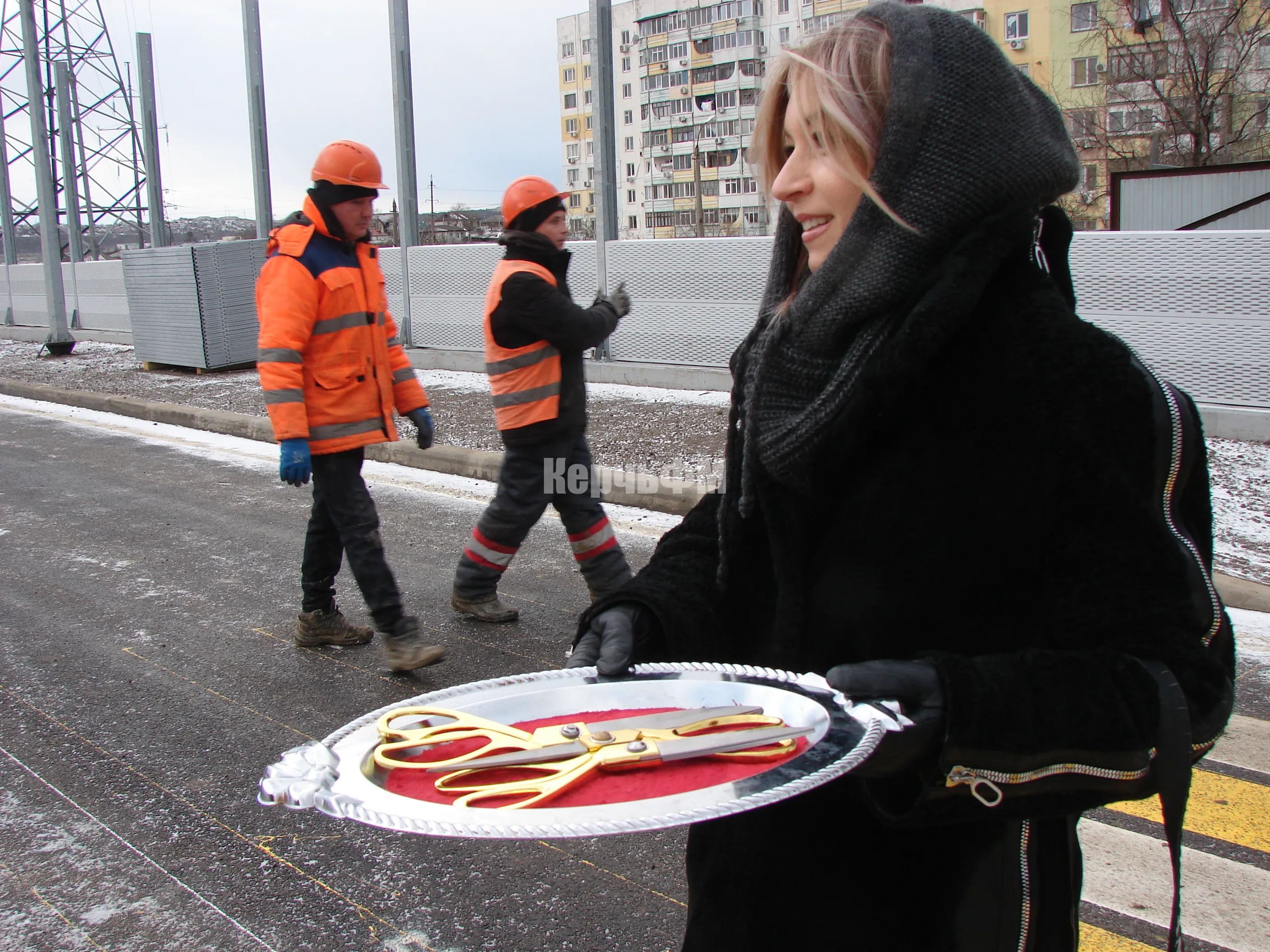 Руководители Керчи вместе с министром транспорта Крыма и представителем заказчика - Службы автомобильных дорог перерезали символическую ленточку на путепроводе и открыли движение.