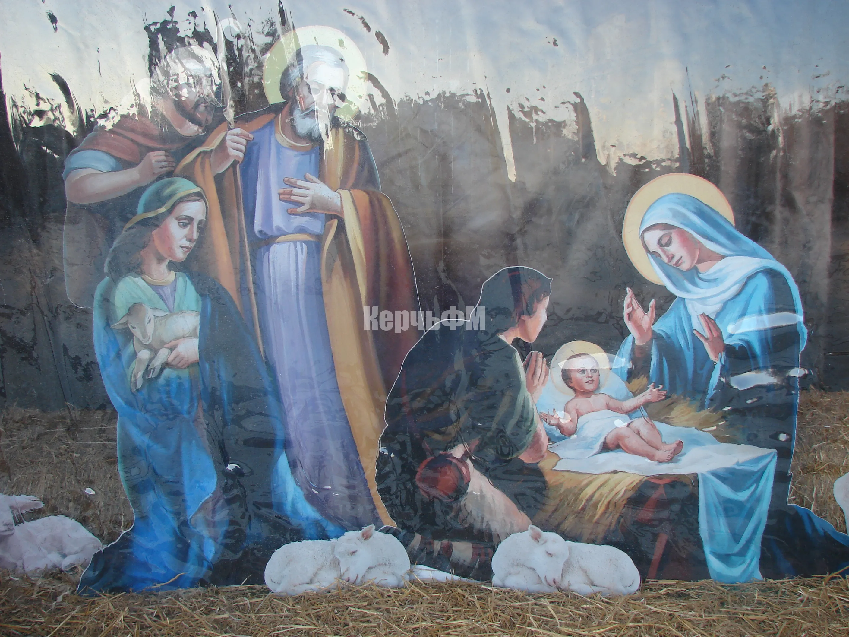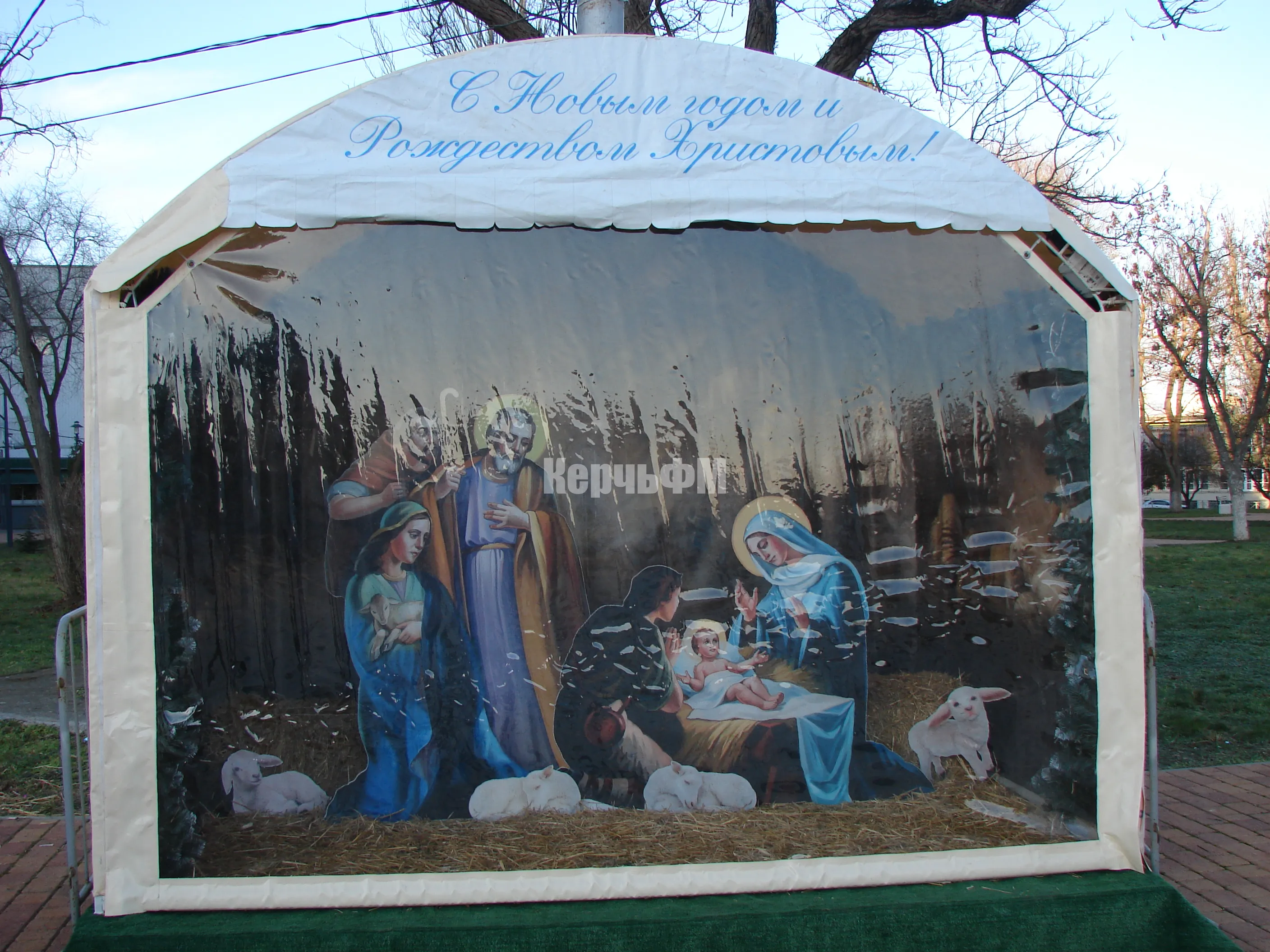 На центральной площади Керчи установили небольшую, укрытую от ветра и осадков, инсталляцию пещеры, где по Священному Писанию родился Иисус Христос.