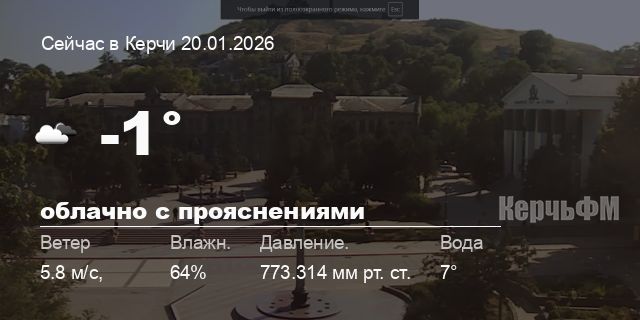 Сегодня днем в Керчи, 20 января, ожидается небольшая облачность, температура воздуха от -1.5° до -0.8°С, ветер северный 6.4 м/с, порывы до 9.71 м/с, давление 773.3 мм рт. ст., влажность 63%.