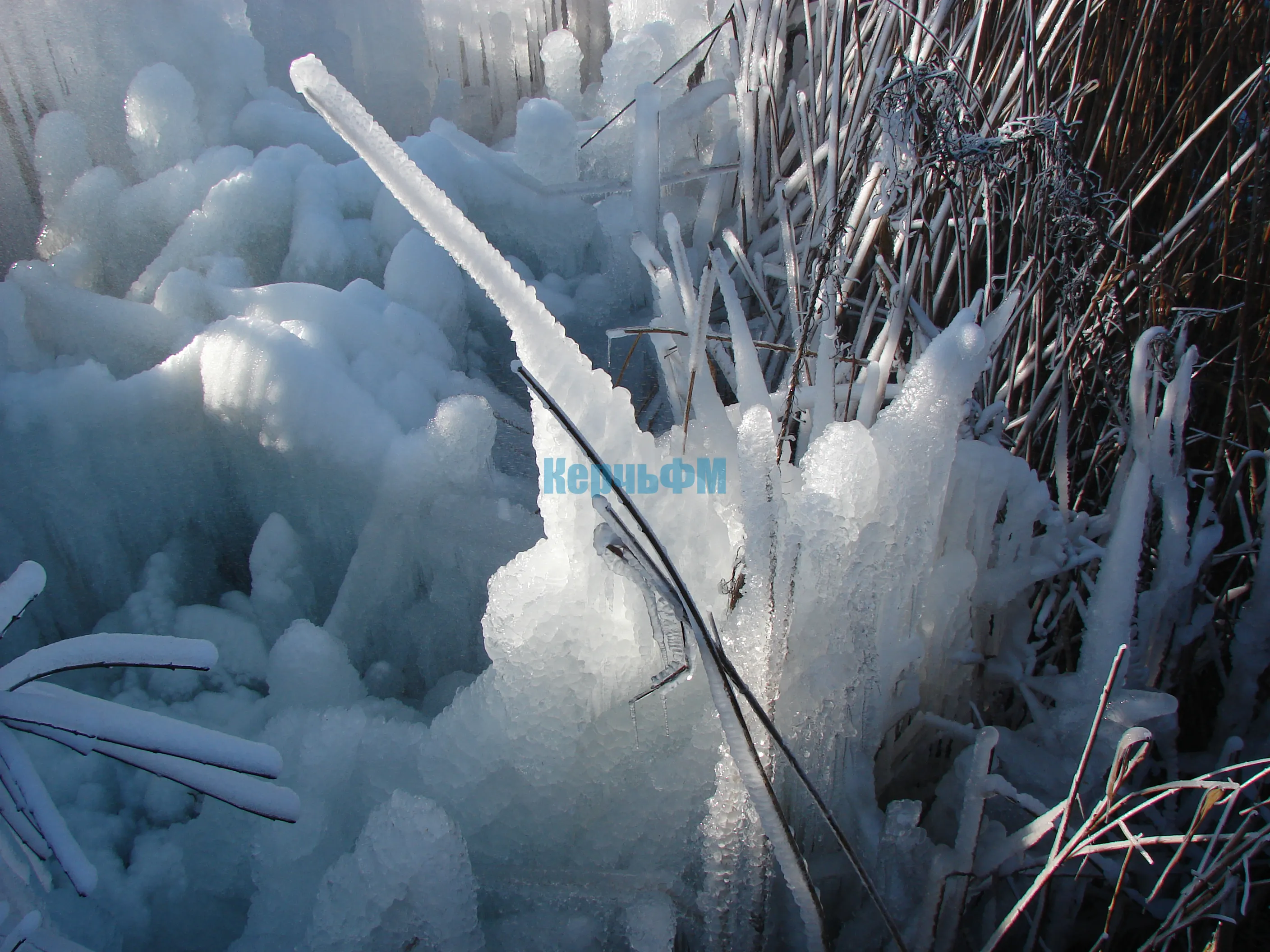 Под мостом образовались ледяные камышовые заросли, передает КерчьФМ.