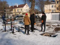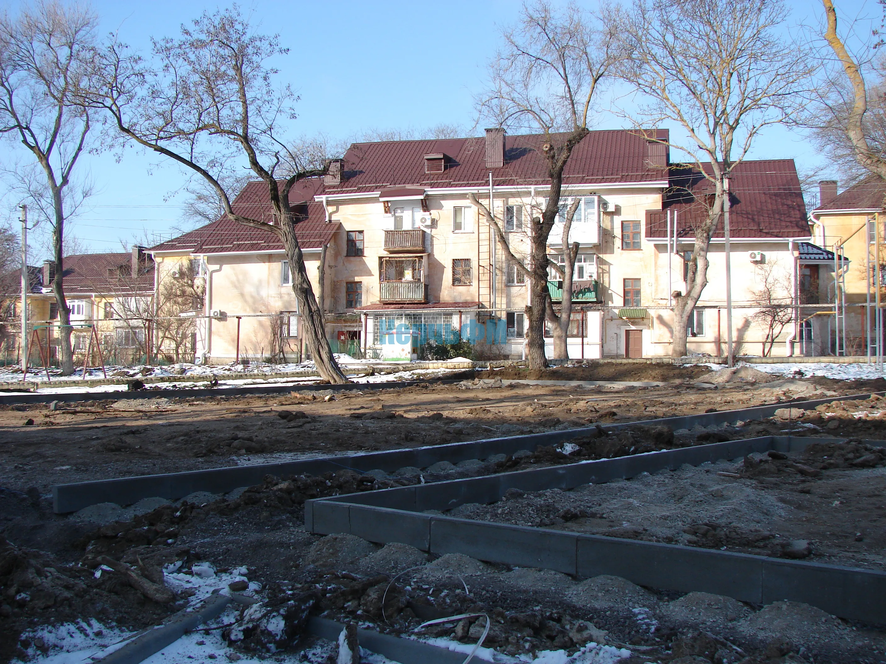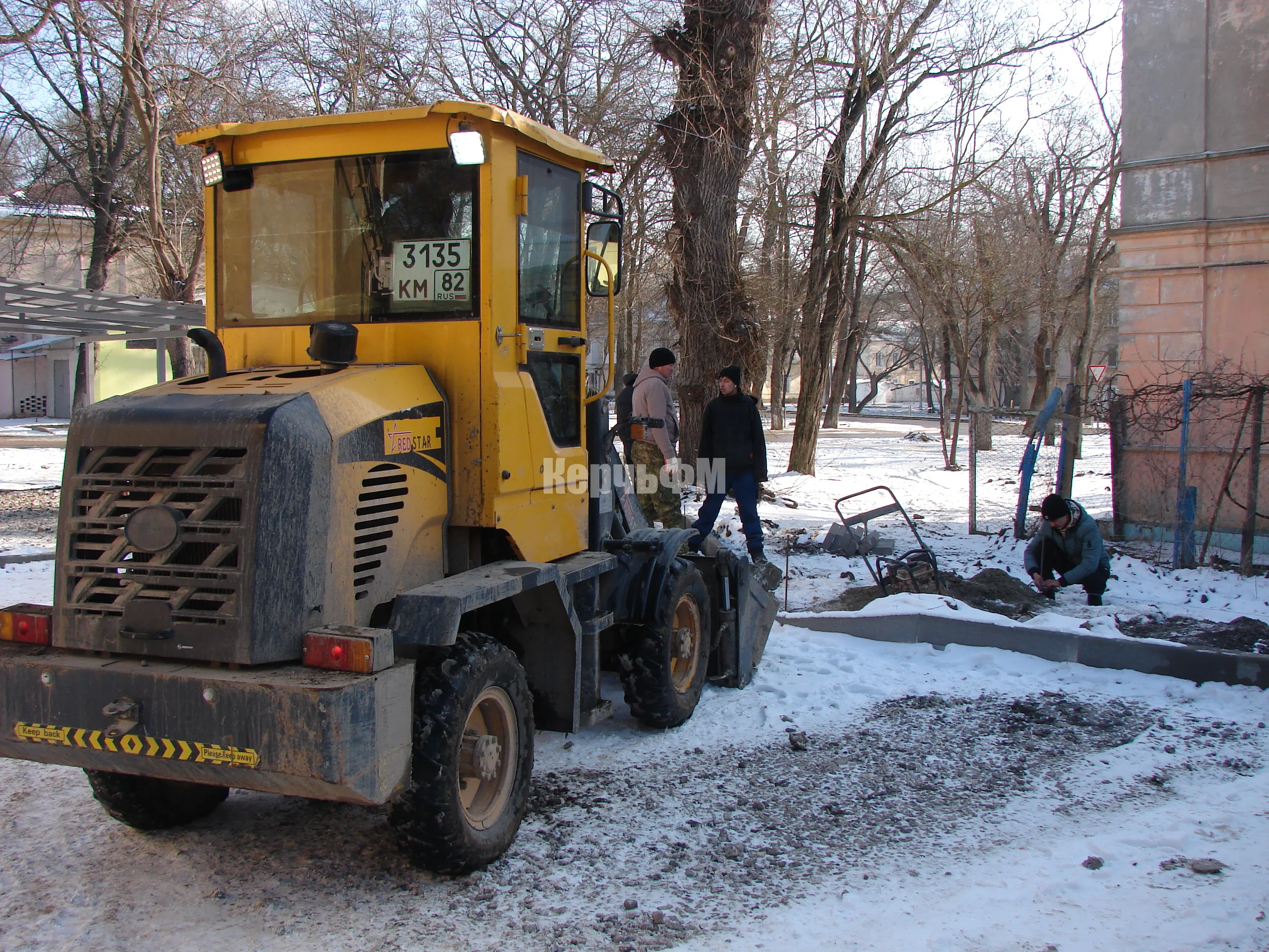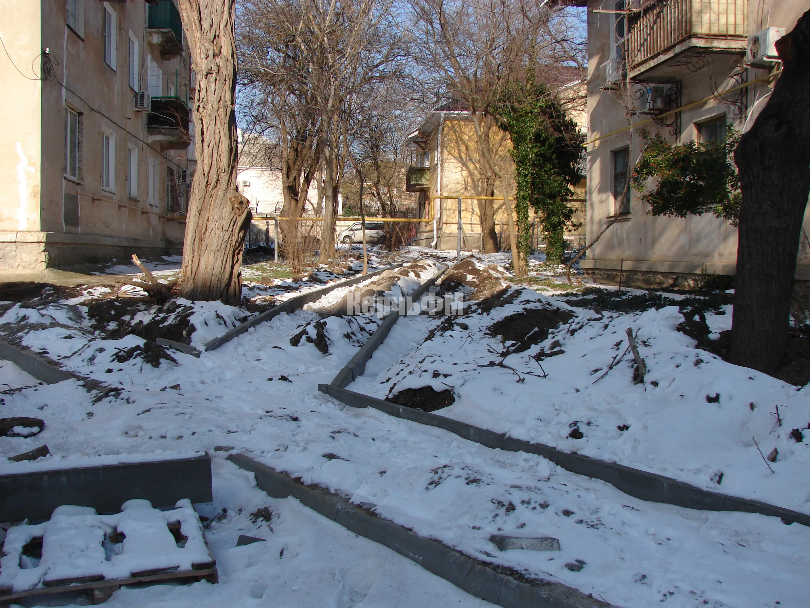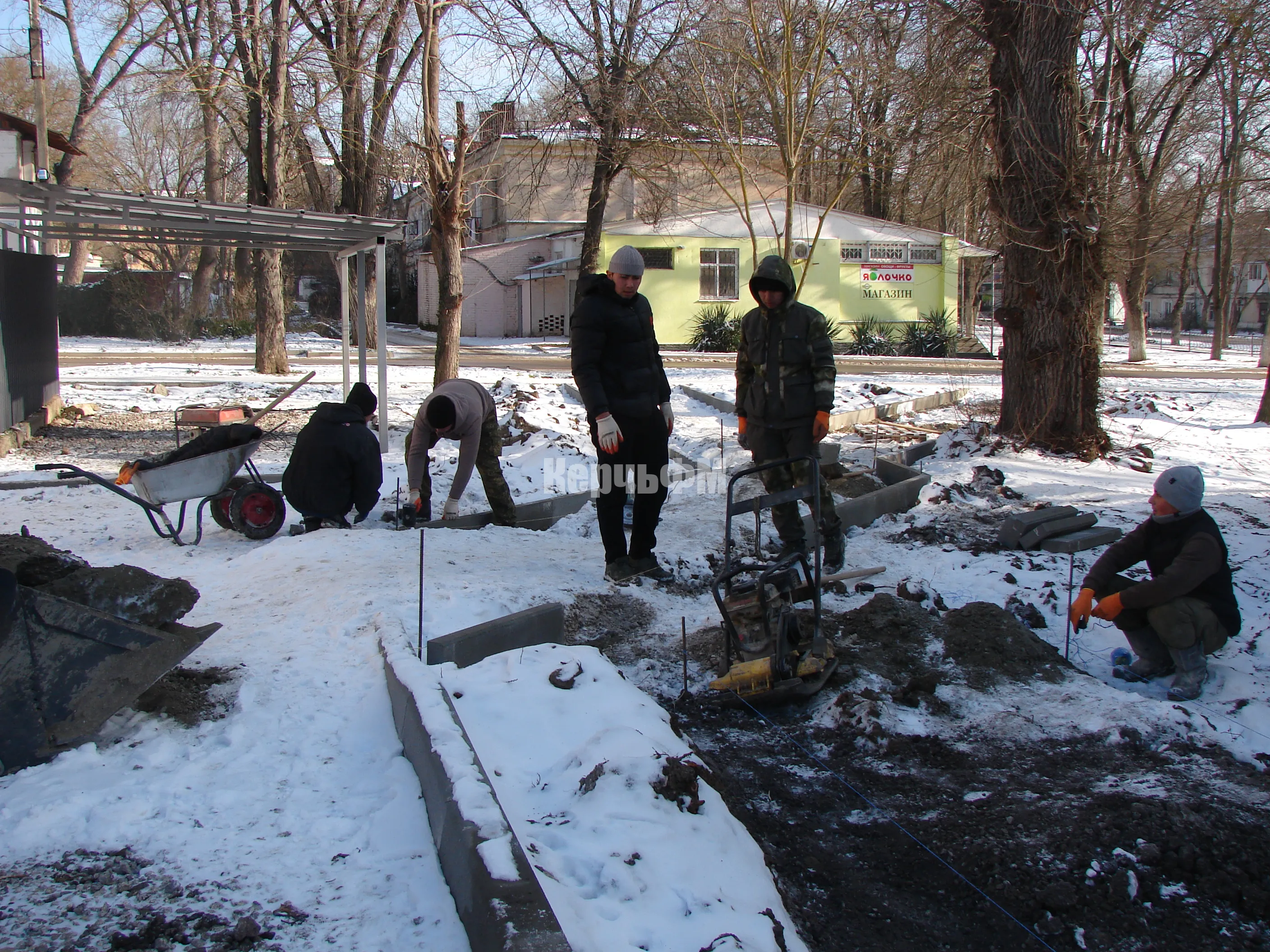 Сложные погодные условия и легкий морозец не останавливают благоустройство придомовых территорий квартала по Казакова-Славы- Войкова.