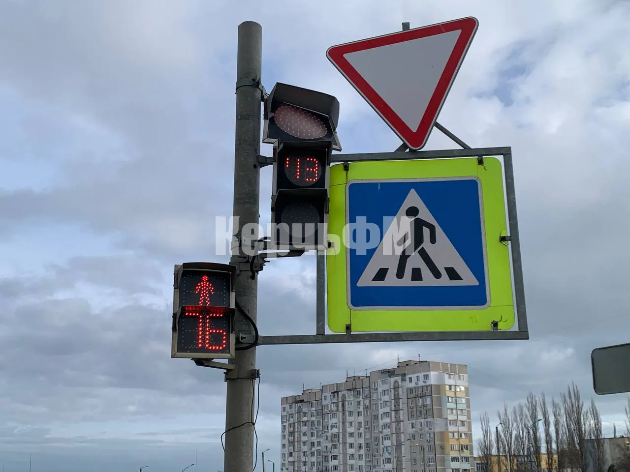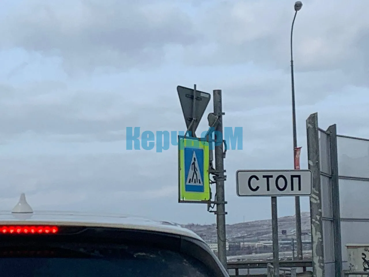 Светофор вывернуло так, что верхний красный сигнал смотрит практически в небо, передает КерчьФМ.