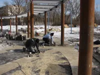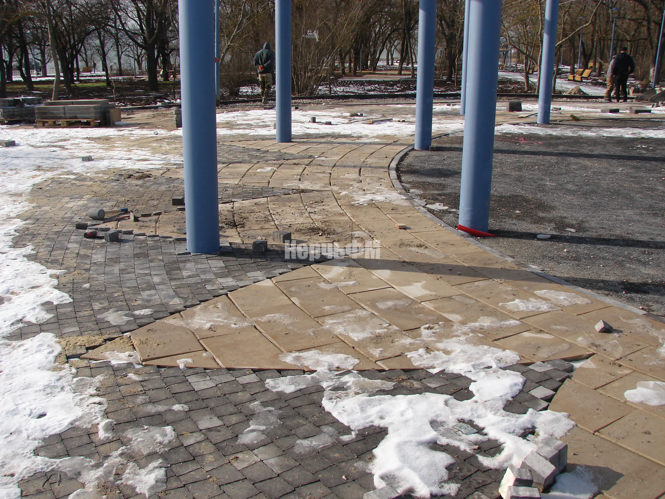 В Приморском парке близятся к завершению работы по укладке новой тротуарной плитки возле фонтана, под перголами.