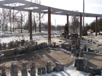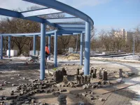 С боковых сторон, и в начале парка, и в конце центральной аллеи, работает тяжелая техника, которая помогает готовить землю под дальнейшее мощение.