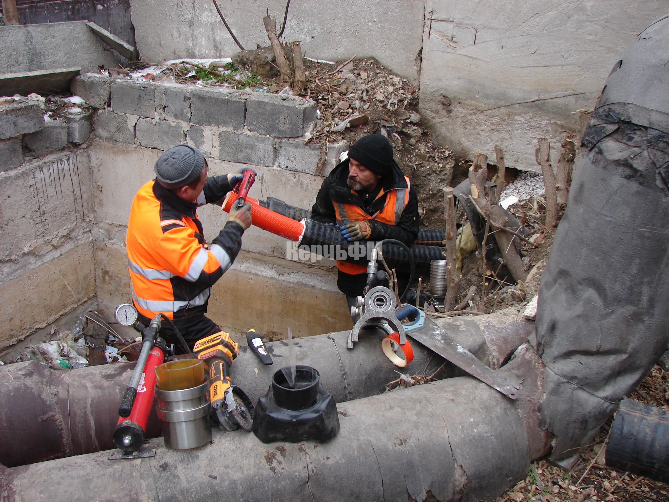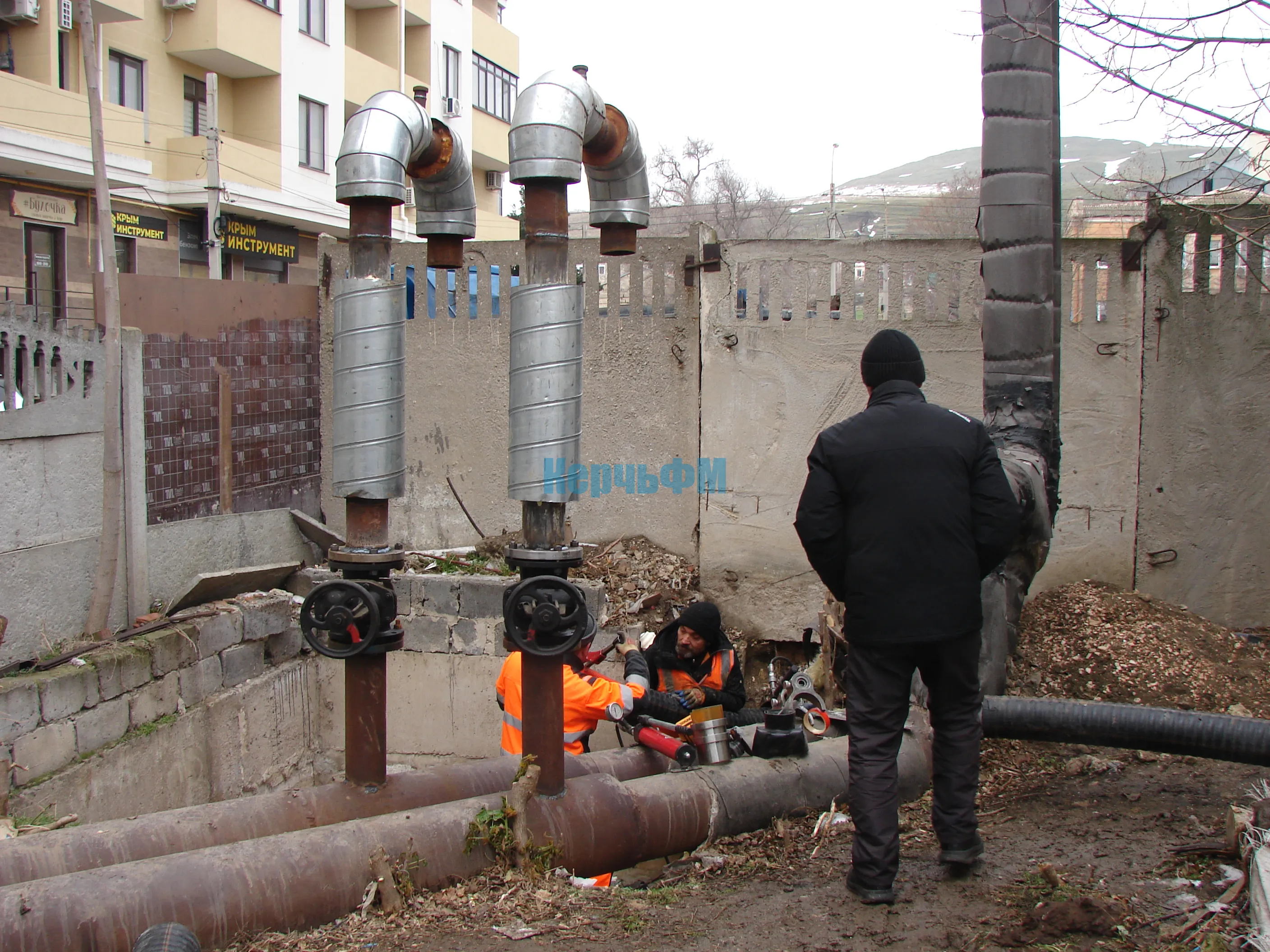 Сегодня специалисты из Симферополя и керченские тепловики проводят монтаж пресс-фитингов для соединения системы нового трубопровода.