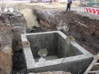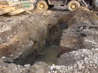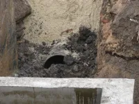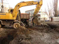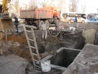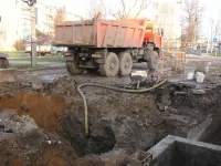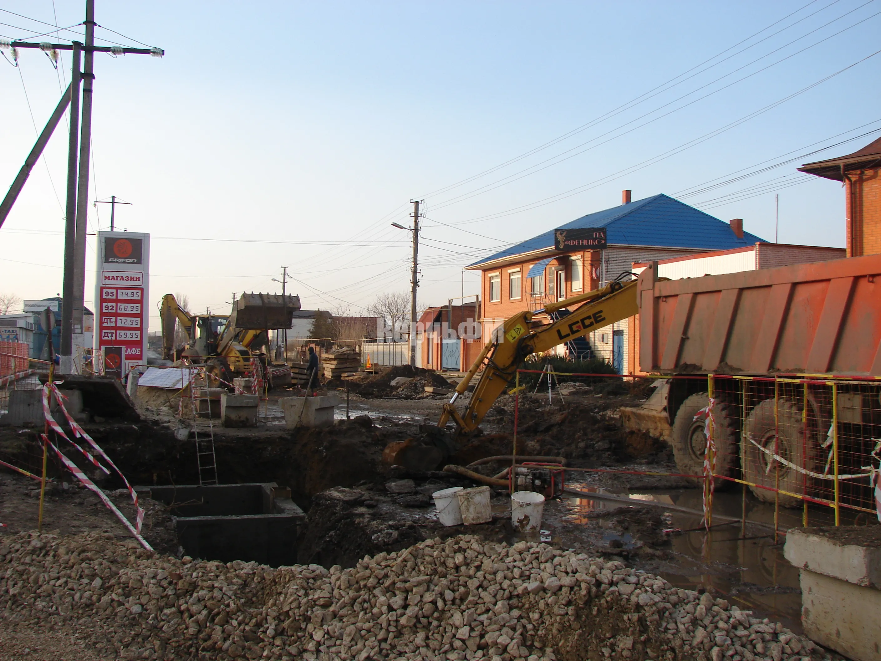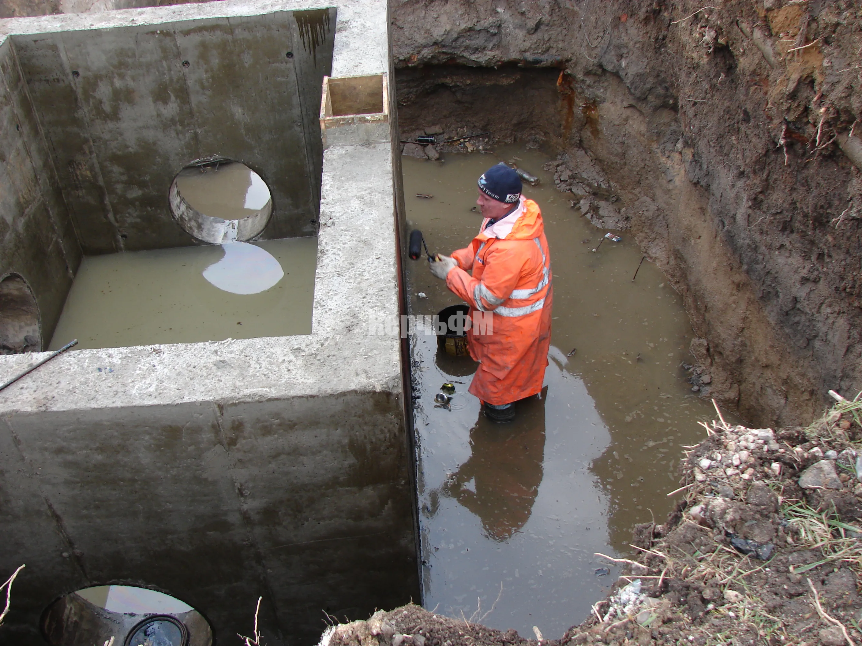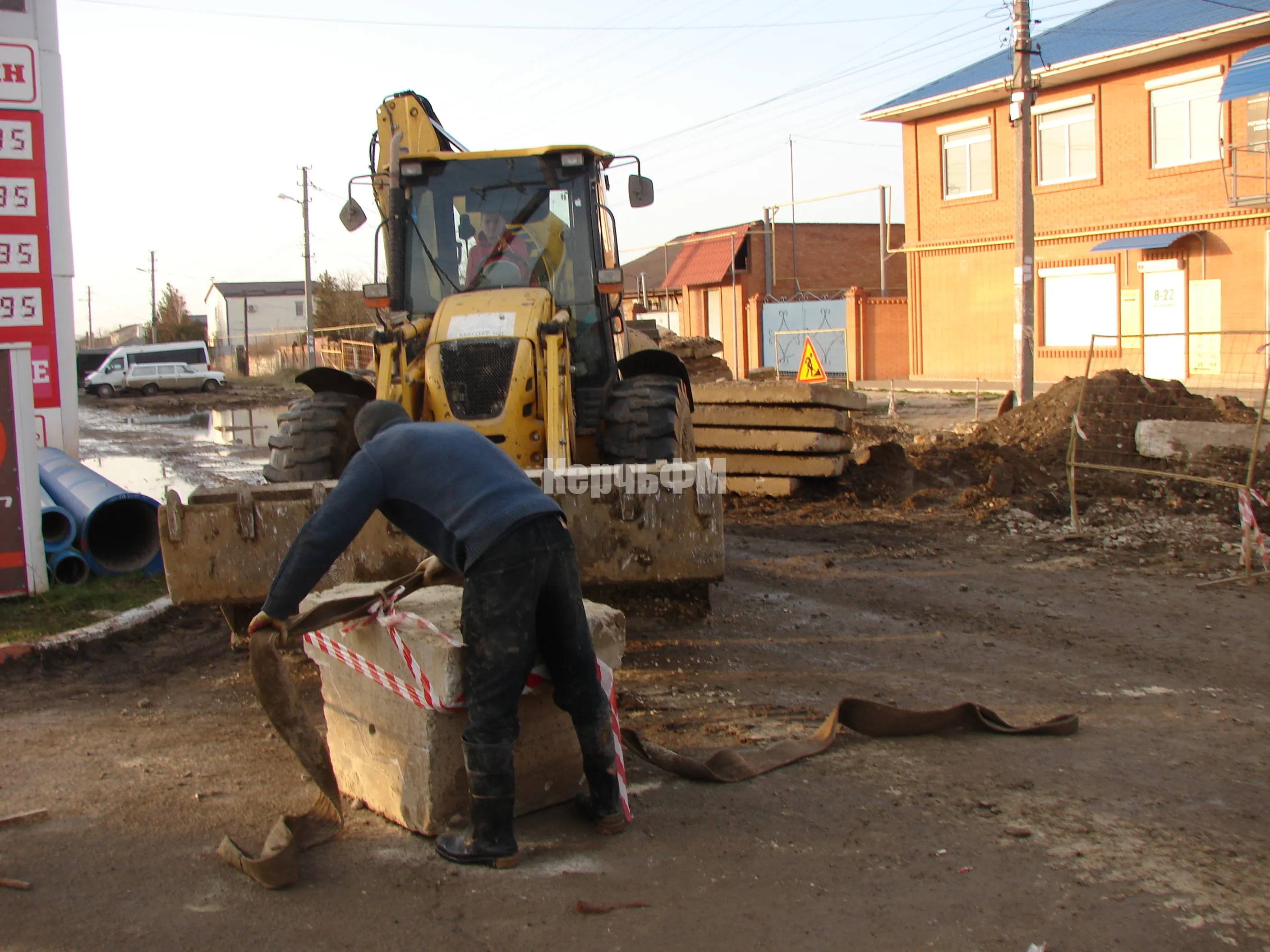 Ведется процесс присоединения труб магистрального водовода, уложенных по Полевой, с новыми трубами, уложенными в грунт по Мирошника.
