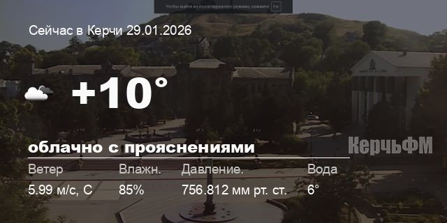 Сегодня днем в Керчи, 29 января, ожидается пасмурная погода, температура воздуха от +8.2° до +10.4°С, ветер северный 7.62 м/с, порывы до 8.54 м/с, давление 755.3 мм рт. ст., влажность 85%.