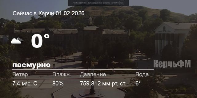 Сегодня днем в Керчи, 01 февраля, ожидается пасмурная погода, температура воздуха от -1.1° до +3.7°С, ветер северный 6 м/с, порывы до 7.88 м/с, давление 762.1 мм рт. ст., влажность 77%.