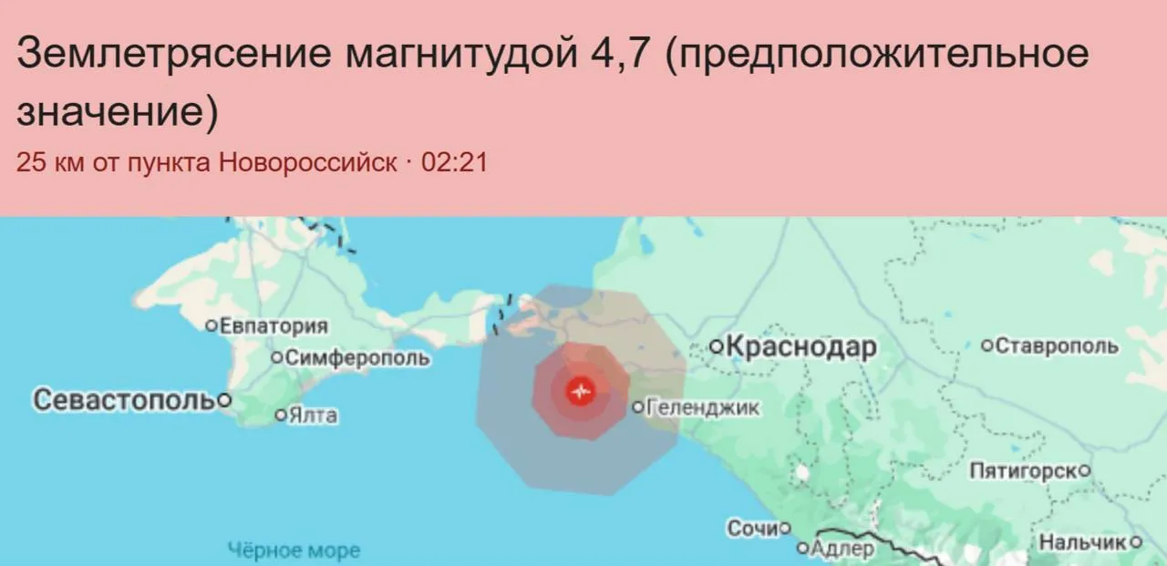 "В ночь на вторник на Кубани произошло землетрясение, его магнитуда по разным оценкам составила 4.5- 4.8. Эпицентр находился в нескольких десятках километров от Анапы и Новороссийска. Спустя пять часов был зафиксирован афтершок.