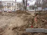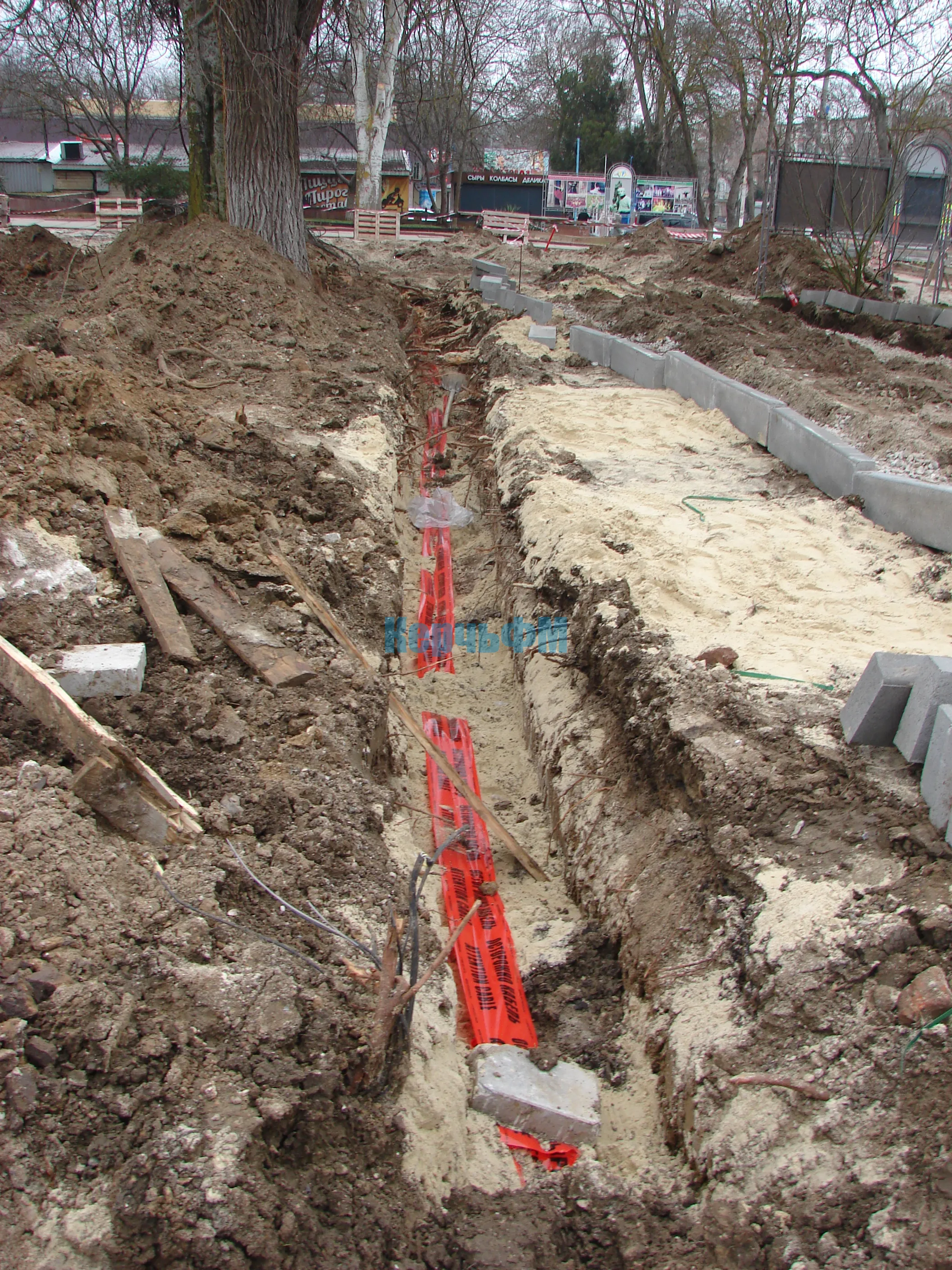 Одновременно в уже выкопанные вдоль них траншеи укладывается кабель для новых фонарей уличного освещения.