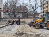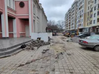 У керченского ЗАГСа тепловики восстанавливают тротуарную плитку после разрытий