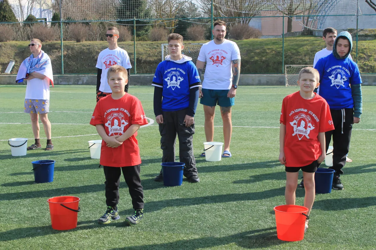 30 отважных керчан разного возраста в футболках цветов государственного флага России синхронно облились ледяной водой, продемонстрировав железную волю и отличную закалку.