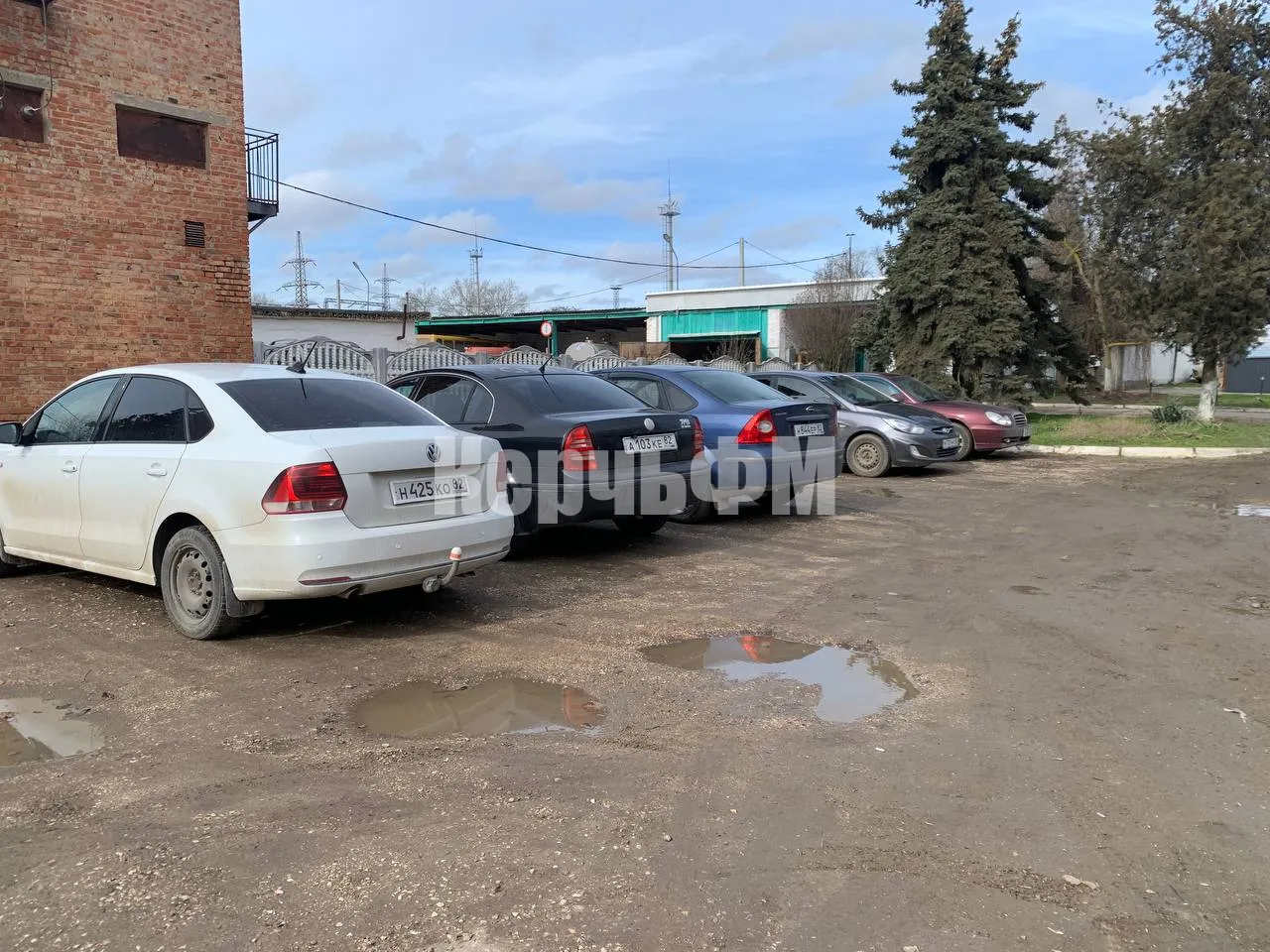 Парковка у здания небольшая и занята автомобилями работников предприятия.