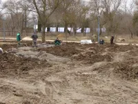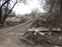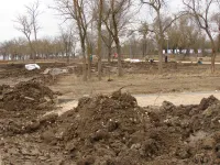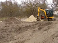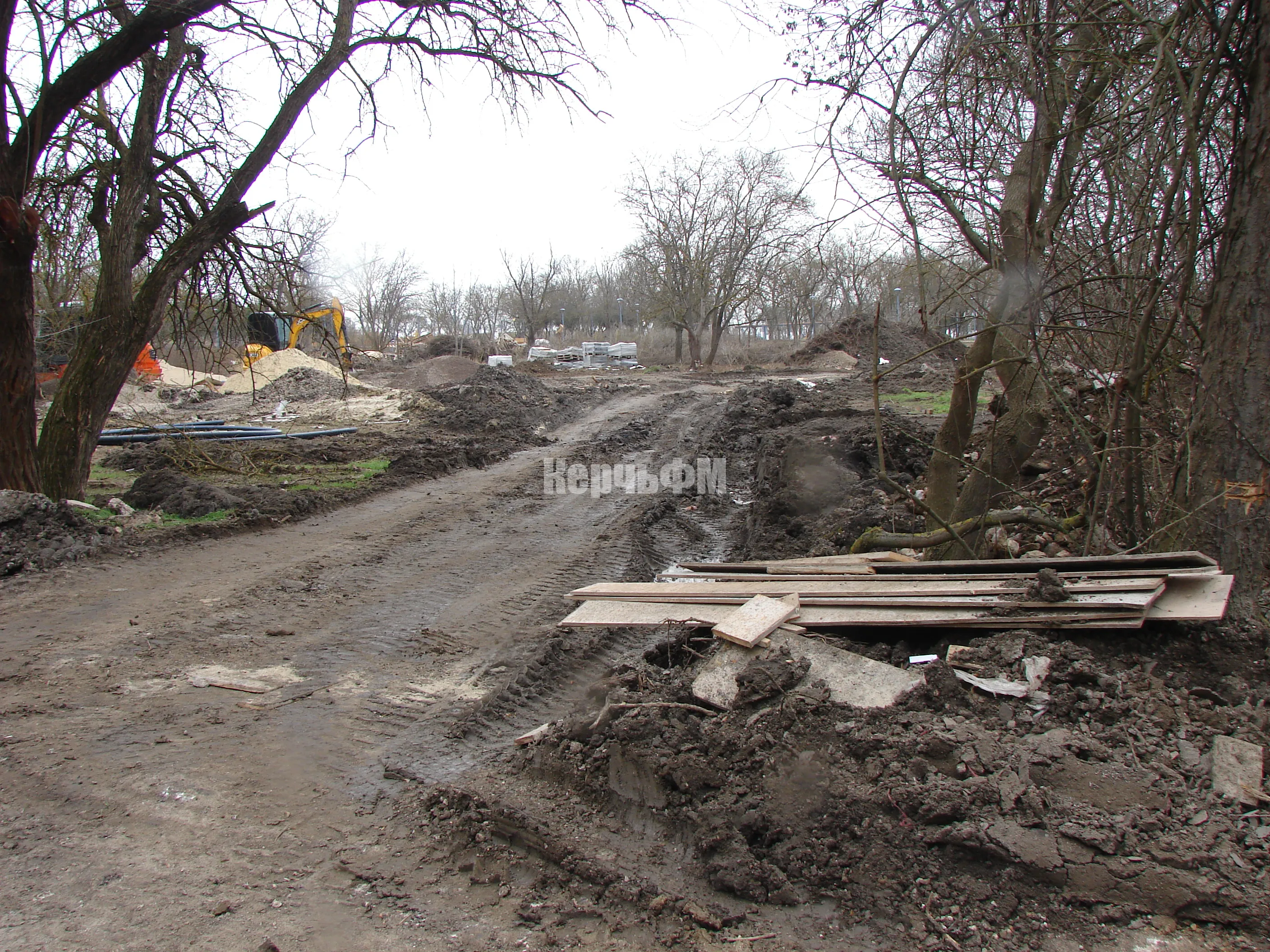 Тяжелая техника продолжает расчистку территории от строительного мусора, разравнивает на участках землю.