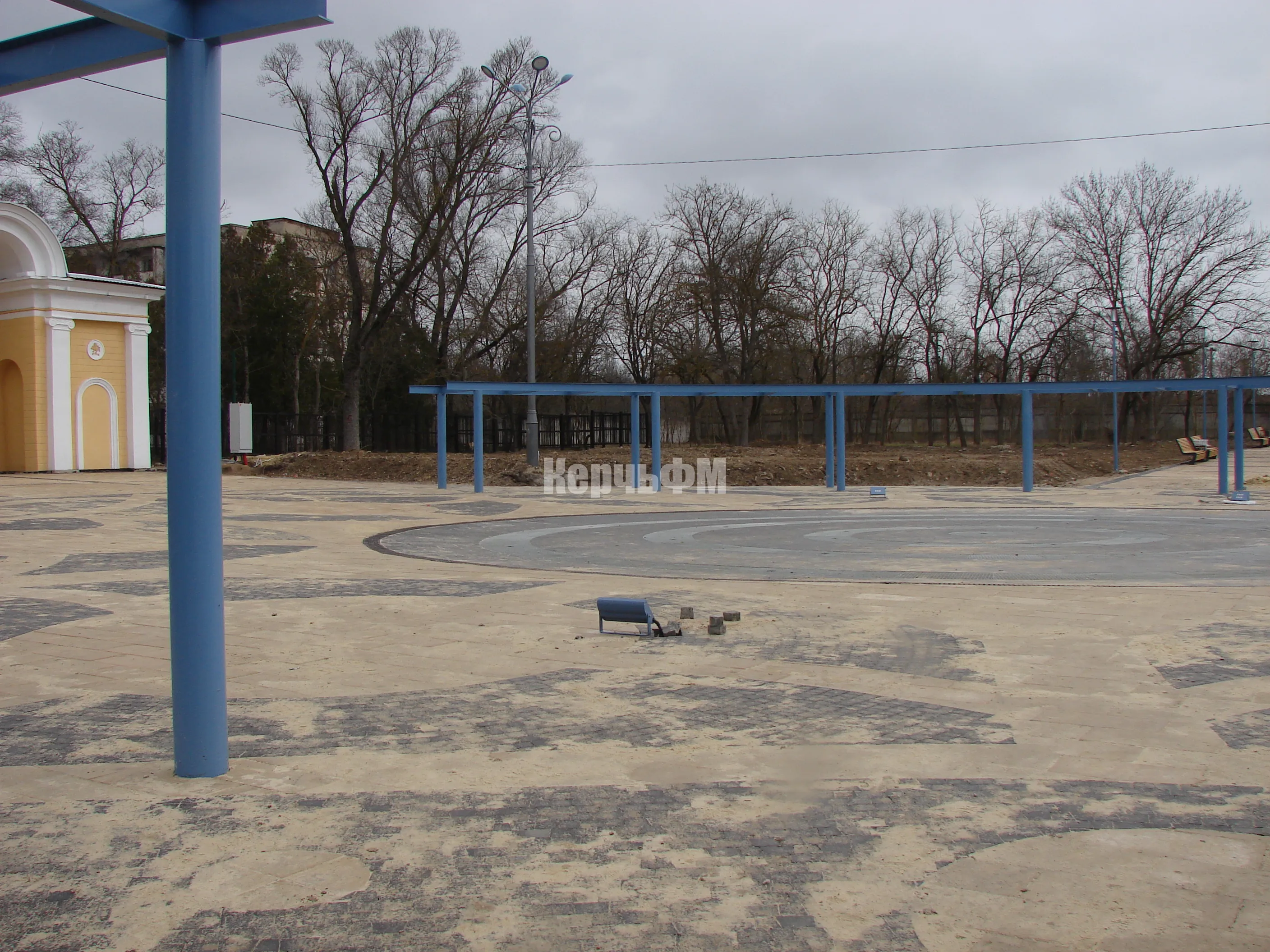 Площадь вокруг фонтана готова и ждет установки скамеек под перголами, металлические конструкции для которых смонтированы полностью.
