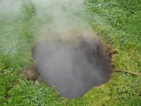 Пар шел из двух ямок на газоне, и со стороны зеленой противоположной обочины дороги.