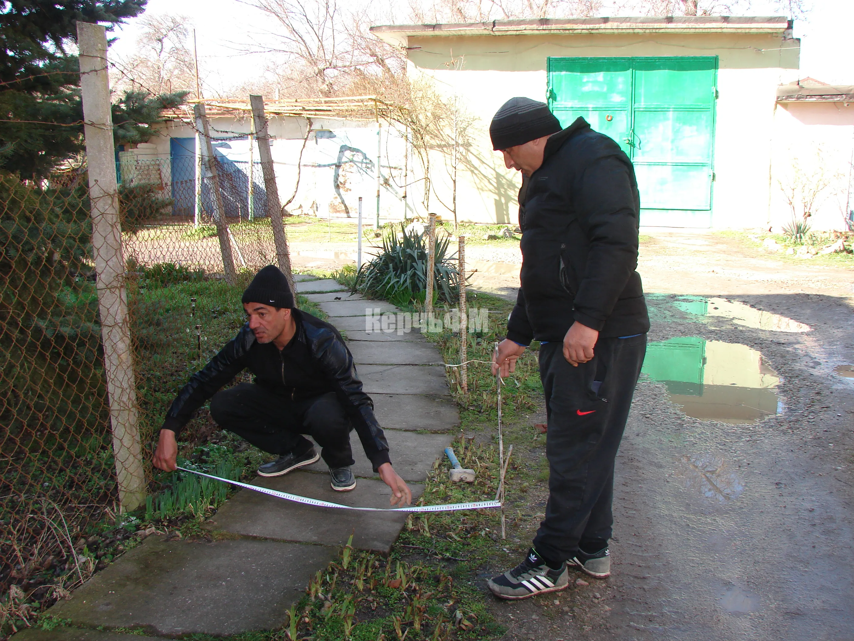 Рабочие вымеряют ширину будущих тротуаров, ведущих к дому, ведут разметку двора под площадки.