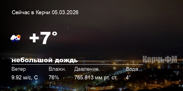 Сегодня днем в Керчи, 05 марта, ожидается небольшой дождь, температура воздуха от +4.4° до +8.3°С, ветер северный 7.36 м/с, порывы до 9.92 м/с, давление 763.6 мм рт. ст., влажность 79%.