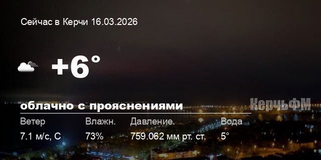 Сегодня днем в Керчи, 16 марта, ожидается малооблачная погода, температура воздуха от +5.4° до +7°С, ветер северный 5.76 м/с, порывы до 9.87 м/с, давление 760.6 мм рт. ст., влажность 72%.