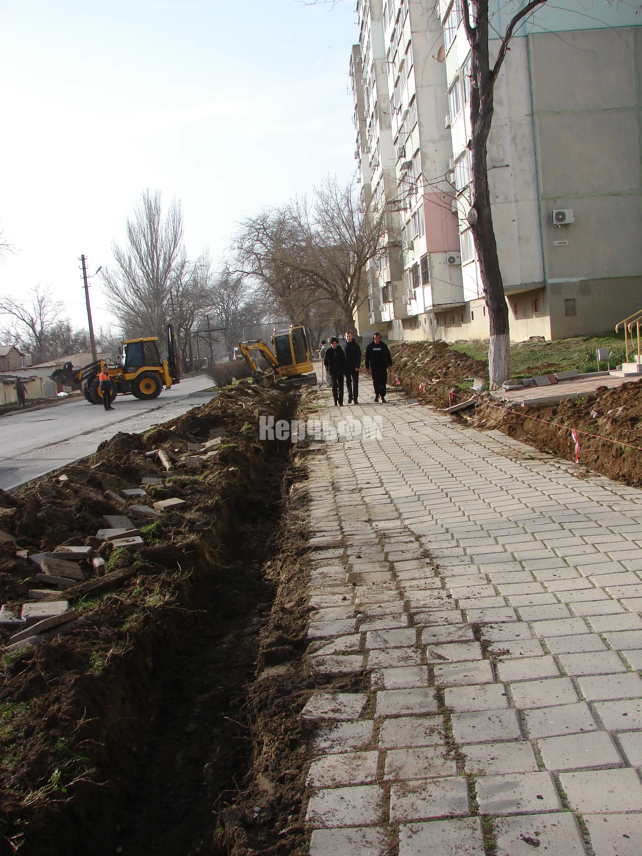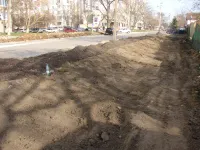 В настоящее время ведется демонтаж старой плитки и бордюрного камня, а также подготовка траншей под укладку бордюров новых.