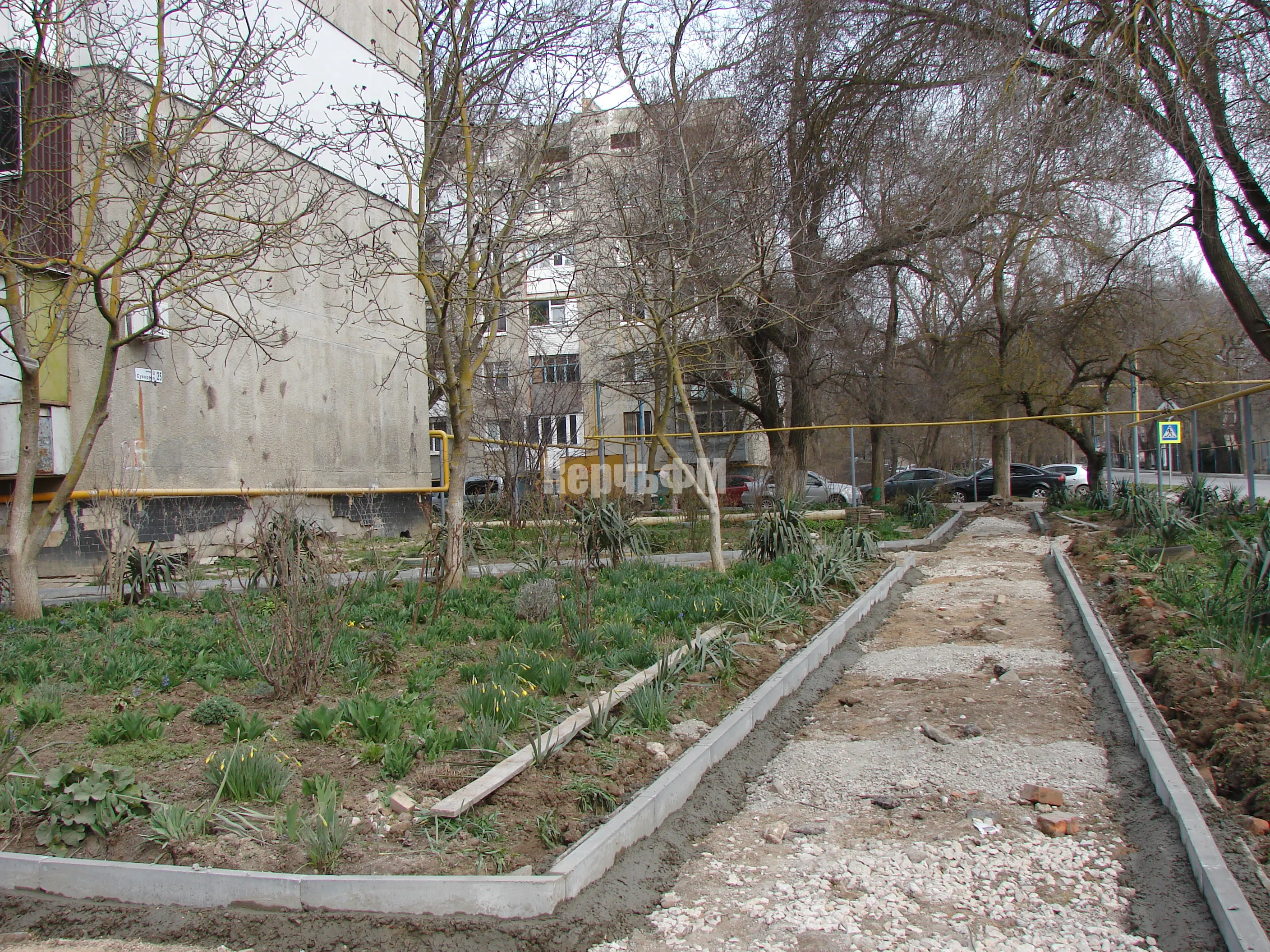 Во дворе по Суворова, 25 продолжается установка поребрика на подходах к подъездам.