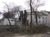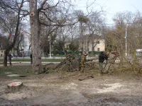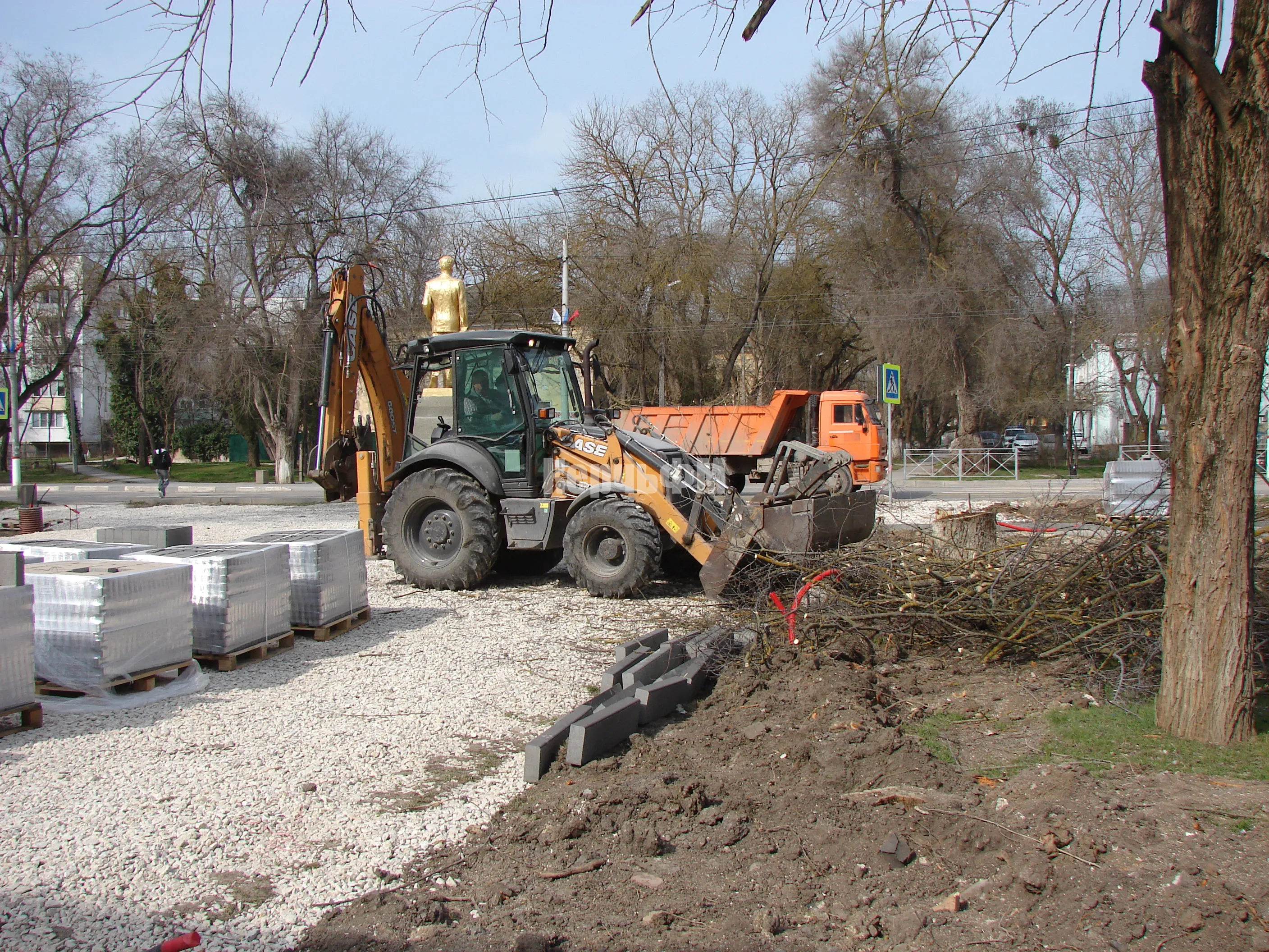 После того, как были сформированы тротуары вдоль ограждения колледжа и параллельный, идущий от улицы Суворова за остановкой, установлены бордюры, засыпаны щебнем дорожки и территория вокруг памятника, Служба городского хозяйства приступила к обрезке кустарников и сухостоя.