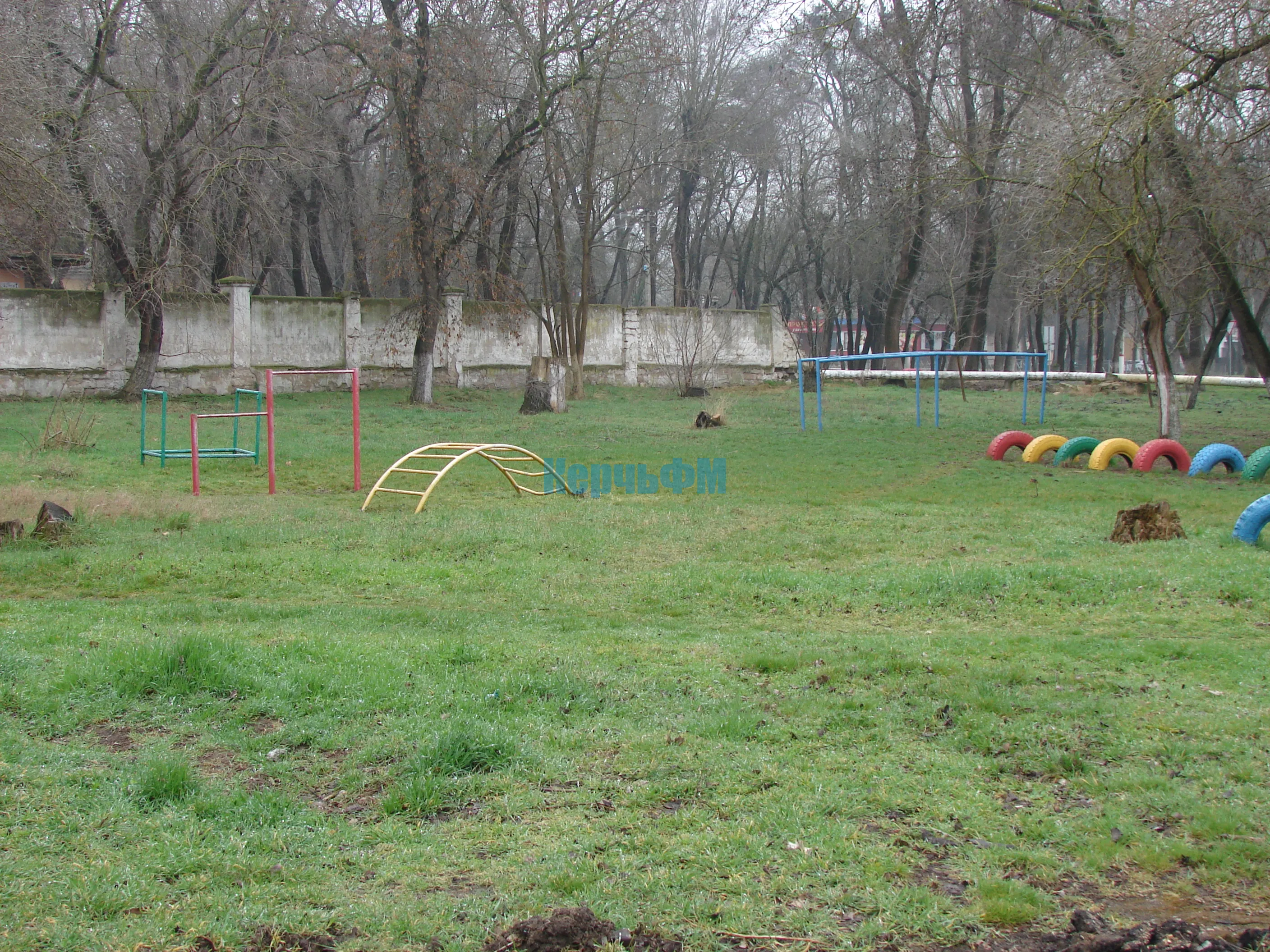 Слева и справа - площадки со старыми спортивными элементами.