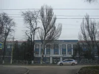За зданием находится парковка с разбитым асфальтом, далее площадка, где учащиеся в теплое время года занимаются физкультурой.