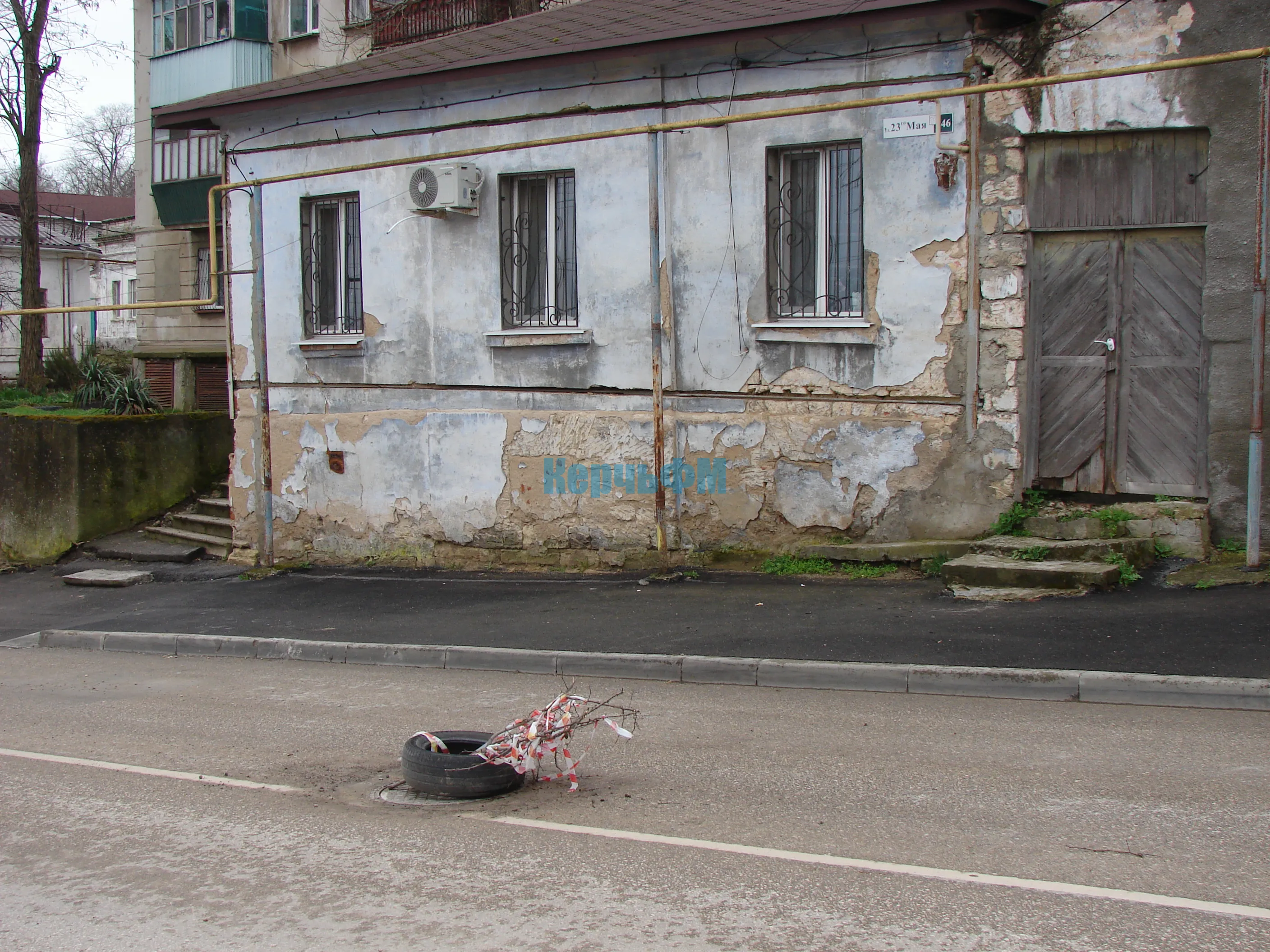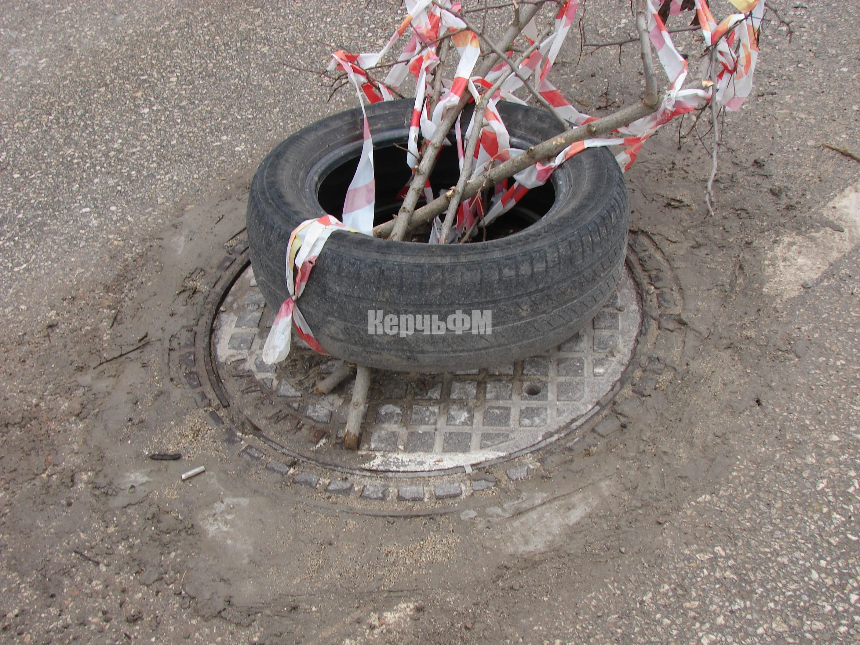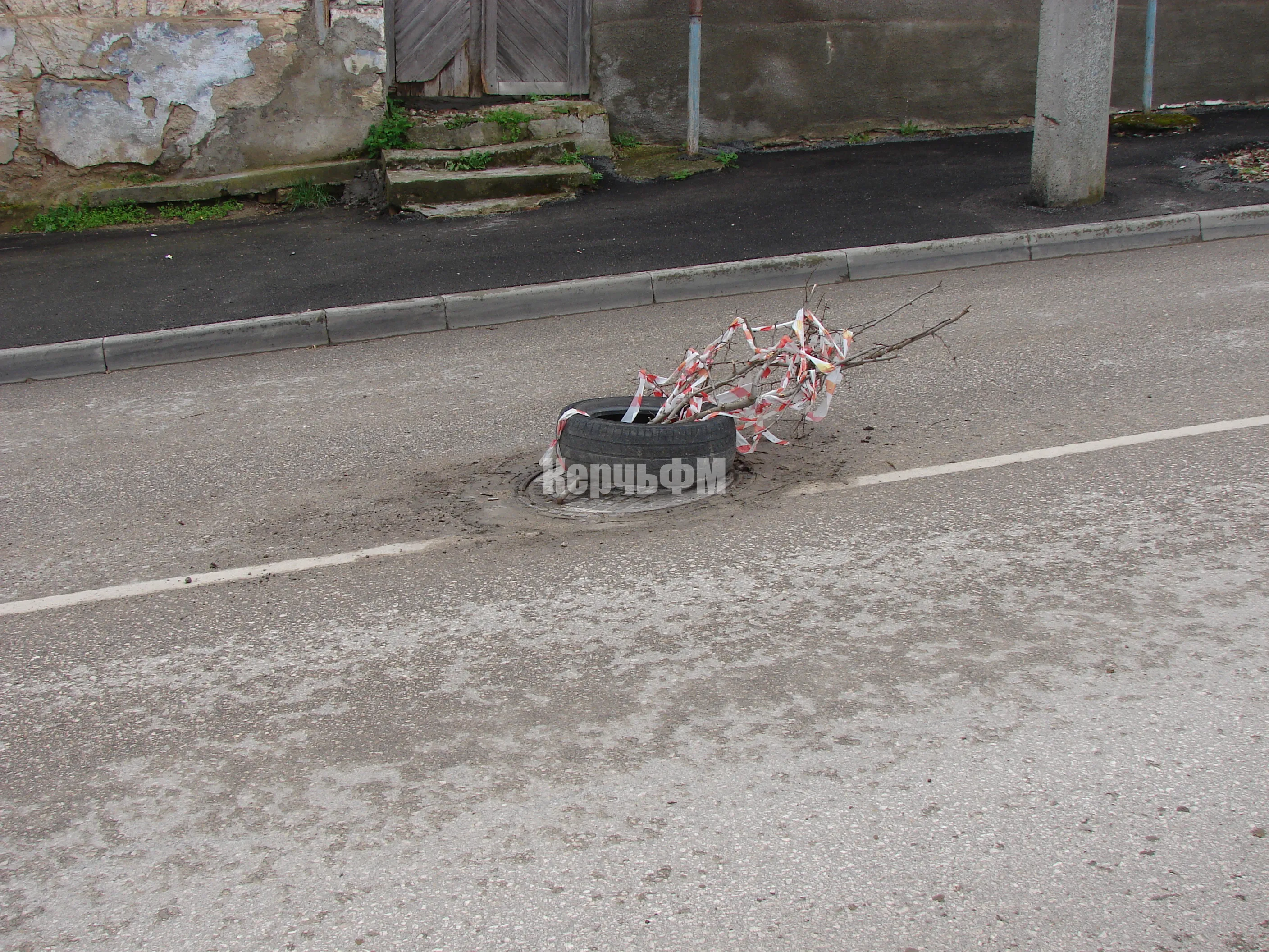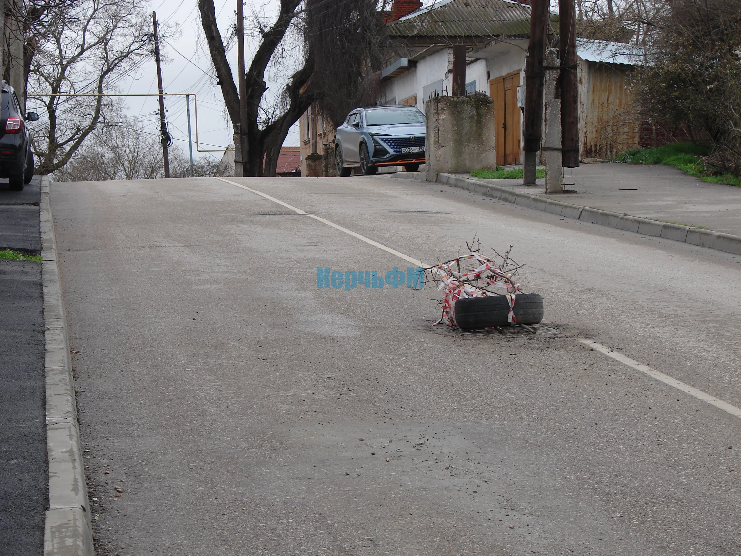 Чтобы бетон хорошо застыл, место оградили автомобильной покрышкой и сигнальной лентой, передает КерчьФМ.