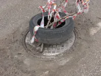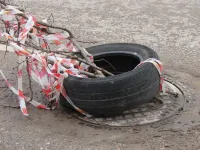 Канализационный колодец на улице 23 Мая огорожен автомобильной покрышкой
