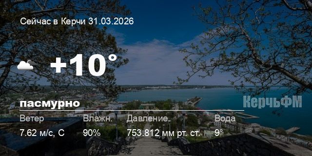 Сегодня днем в Керчи, 31 марта, ожидается пасмурная погода, температура воздуха от +9.5° до +10.6°С, ветер северный 5.93 м/с, порывы до 9.08 м/с, давление 755.3 мм рт. ст., влажность 85%.