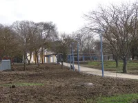 На нескольких боковых пешеходных дорожках не уложена еще тротуарная плитка. Хотя основание готово.