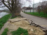 На втором ярусе общественной зоны сегодня ведется демонтаж бордюрного камня вдоль аллеи.