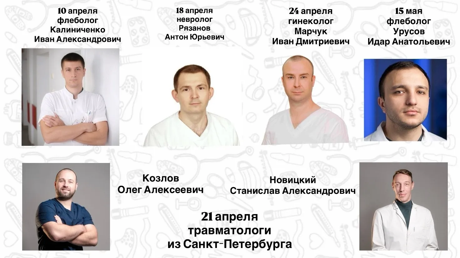 • консультация следующих специалистов: Таран В.В. (сосудистый хирург), Акульшина С.П. (гастроэнтеролог), Еремизина Л.Н.(эндокринолог), Збруев Н.Н. (кардиолог), Силкин Е.Г. (кардиолог), Фаленко С.И. (гинеколог), Олейниченко Н.Ю. (гинеколог), Коробко Т.Н. (нефролог), Голиков А.Г. (специалист узи), Ломакин  В.Г. (уролог), Нор Г.С. (специалист узи), Николаиди О.В. (специалист узи), Гирина Л.Г. (специалист узи).