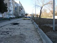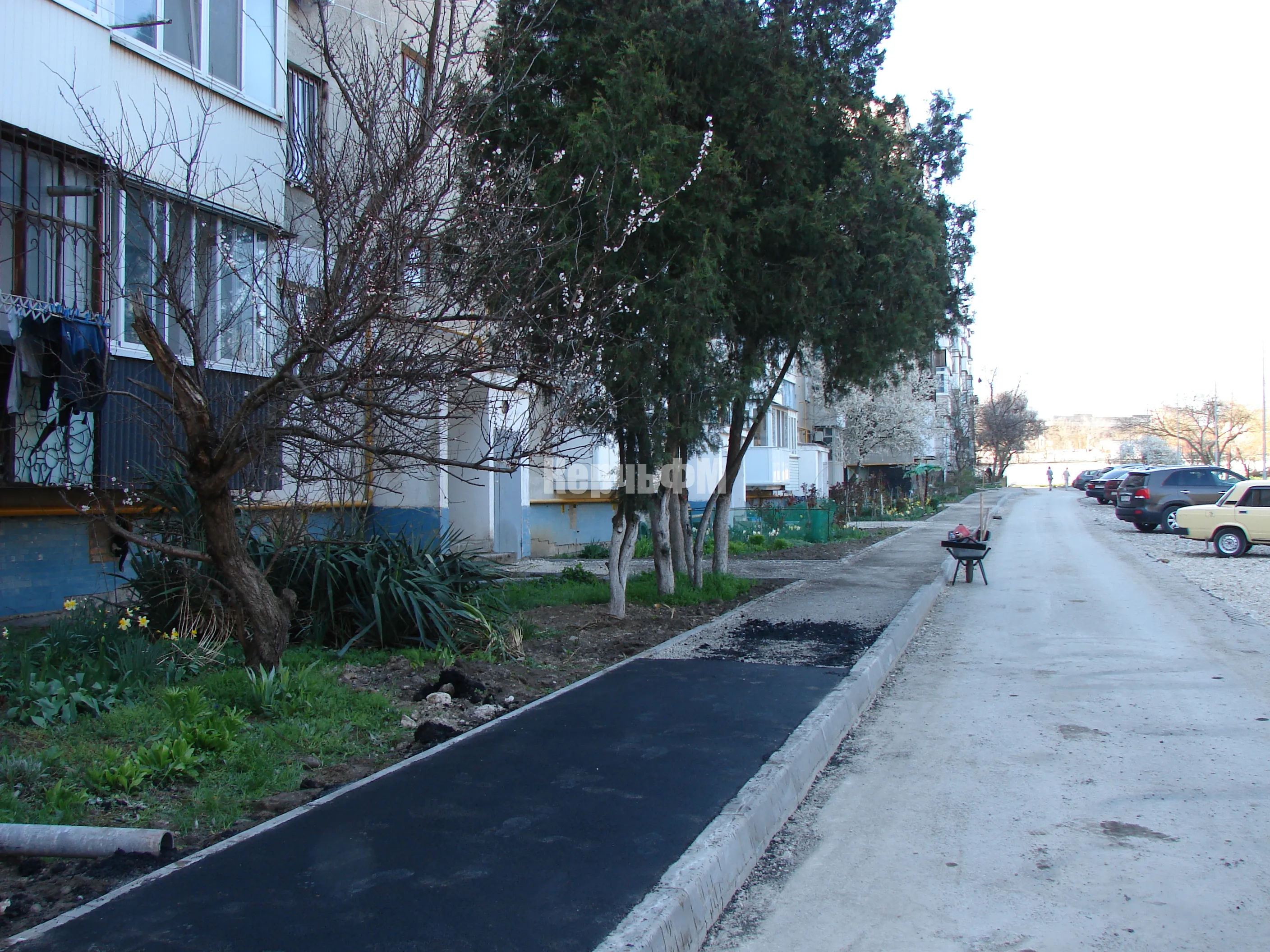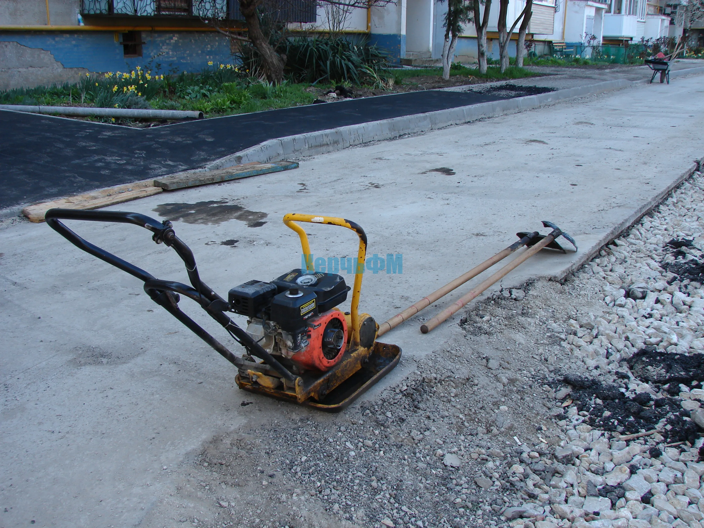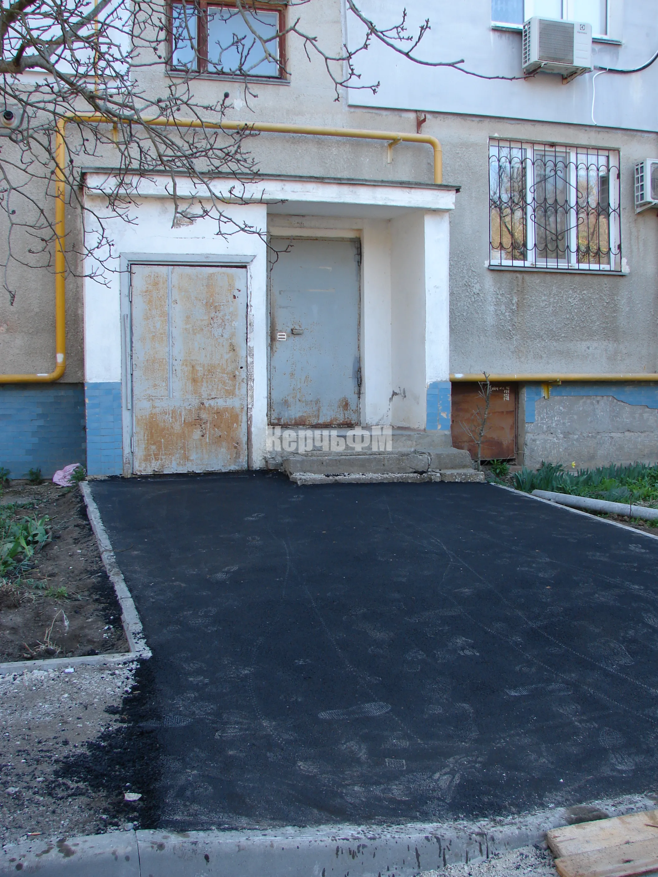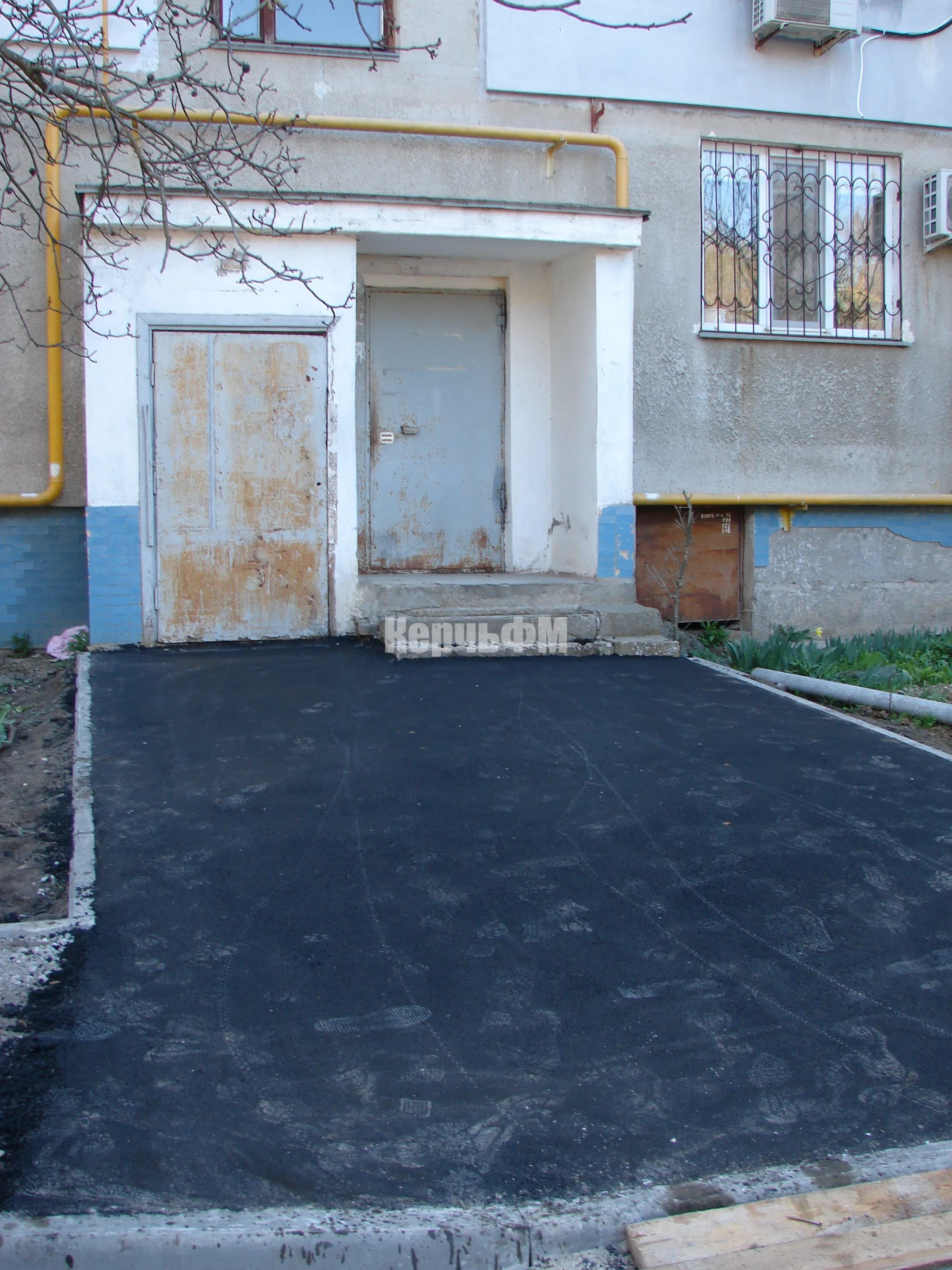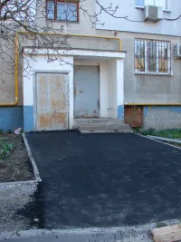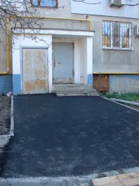 После того, как вдоль тротуара у дома и входных групп были установлены бордюры и подготовлено основание для укладки покрытия, асфальтирование началось с первого подъезда.