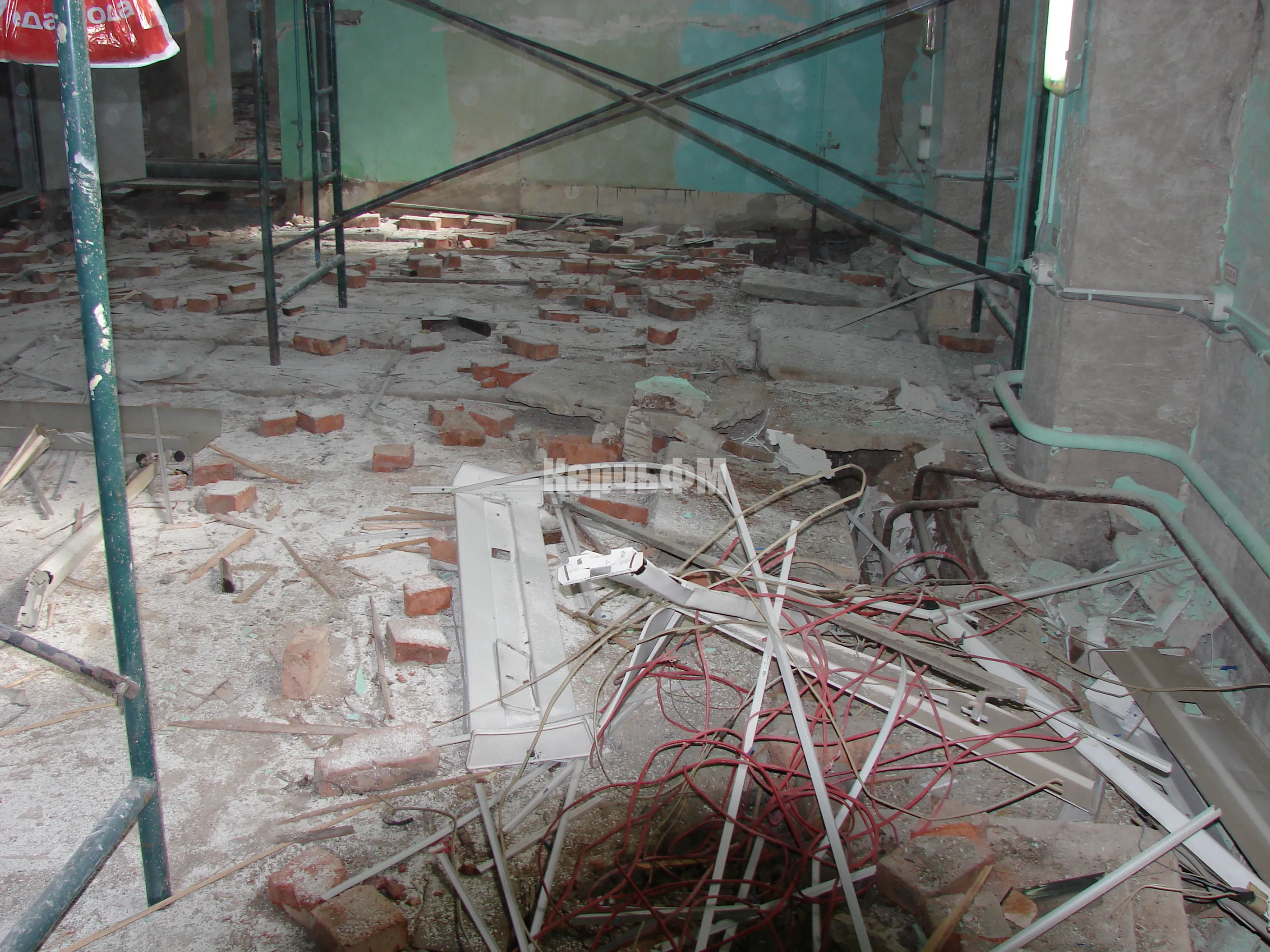Строители сегодня заняты подготовкой потолков в правом крыле здания: удаляют старую побелку, зачищают швы.
