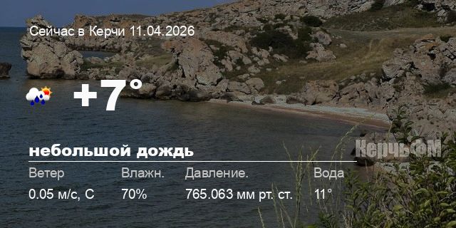 Сегодня днем в Керчи, 11 апреля, ожидается небольшой дождь, температура воздуха от +5.3° до +8.6°С, ветер северный 0.29 м/с, порывы до 1.32 м/с, давление 765.8 мм рт. ст., влажность 64%.