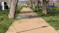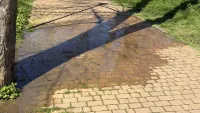 Часть тротуара находится в воде. Кубы воды уходят прямо в землю.