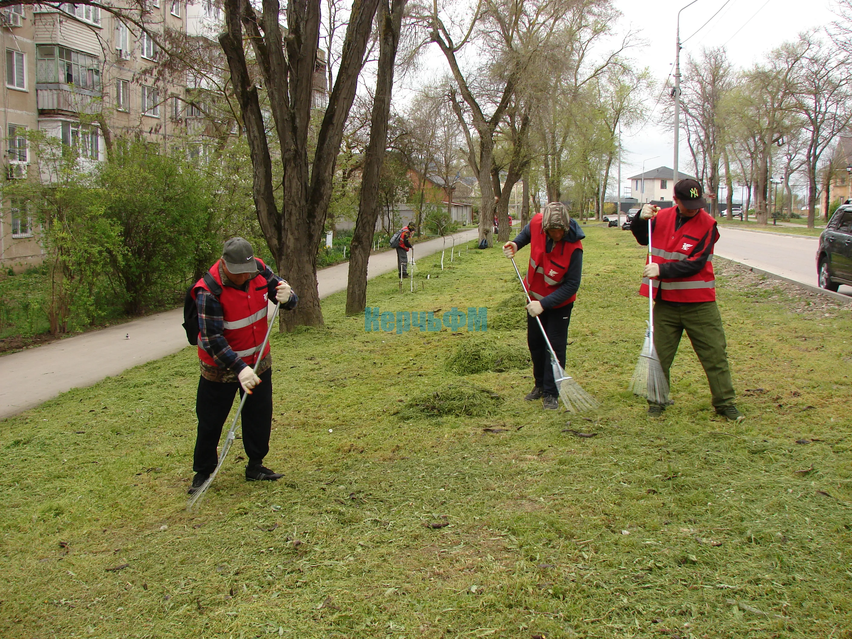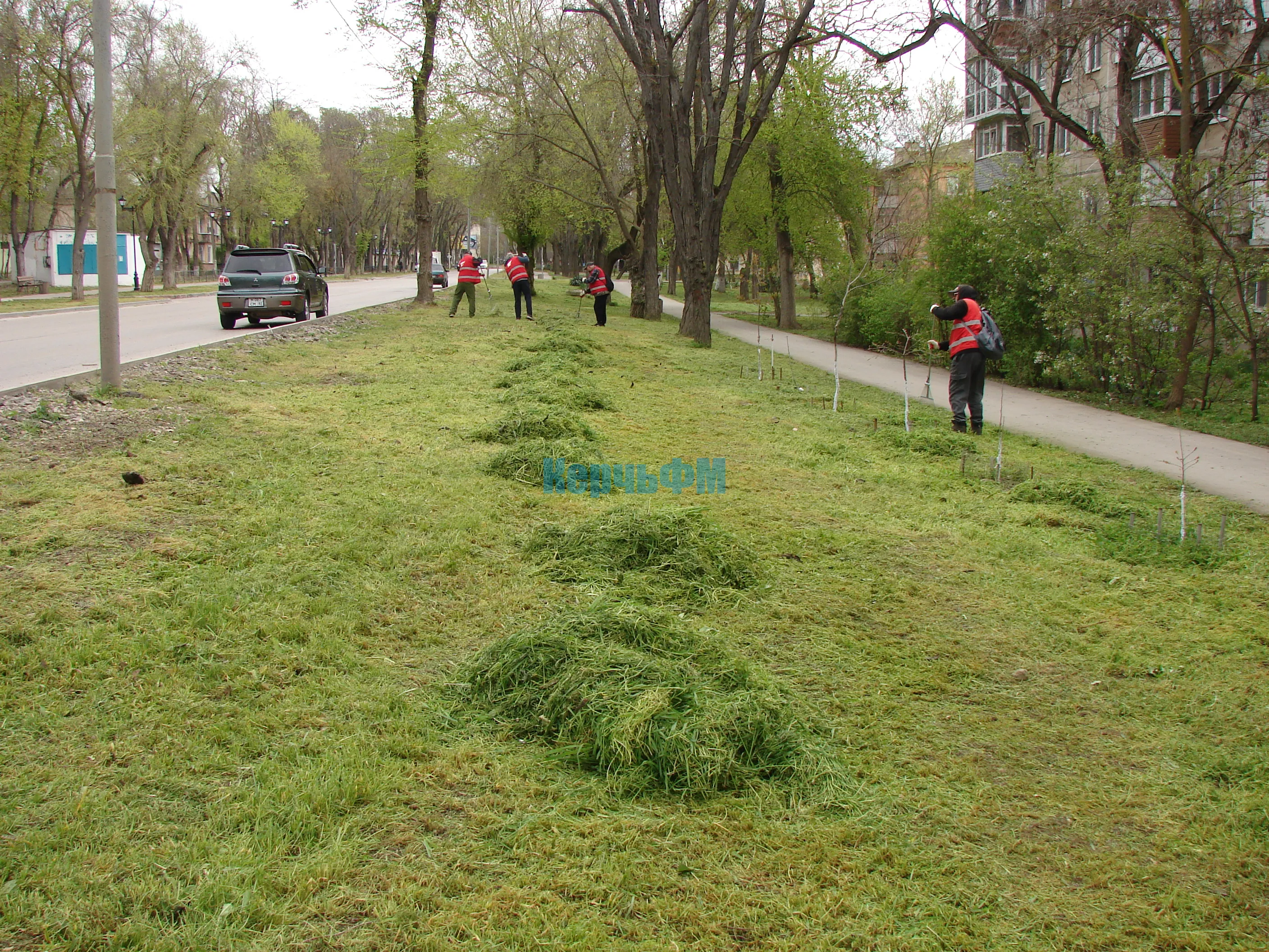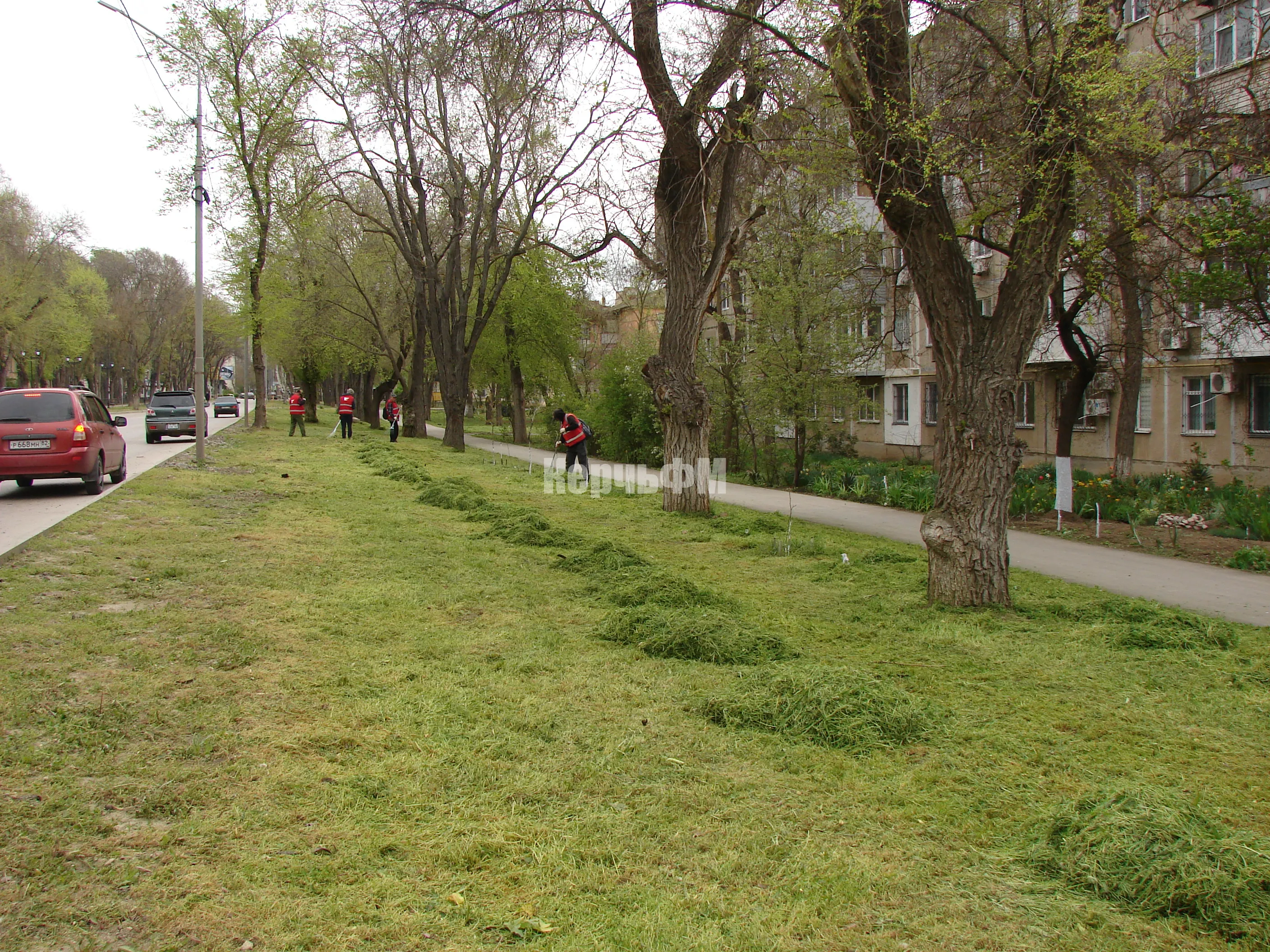 Сегодня скошенную траву бригады в красных жилетах убирали с газонов вдоль улицы Казакова и Войкова, передает КерчьФМ.