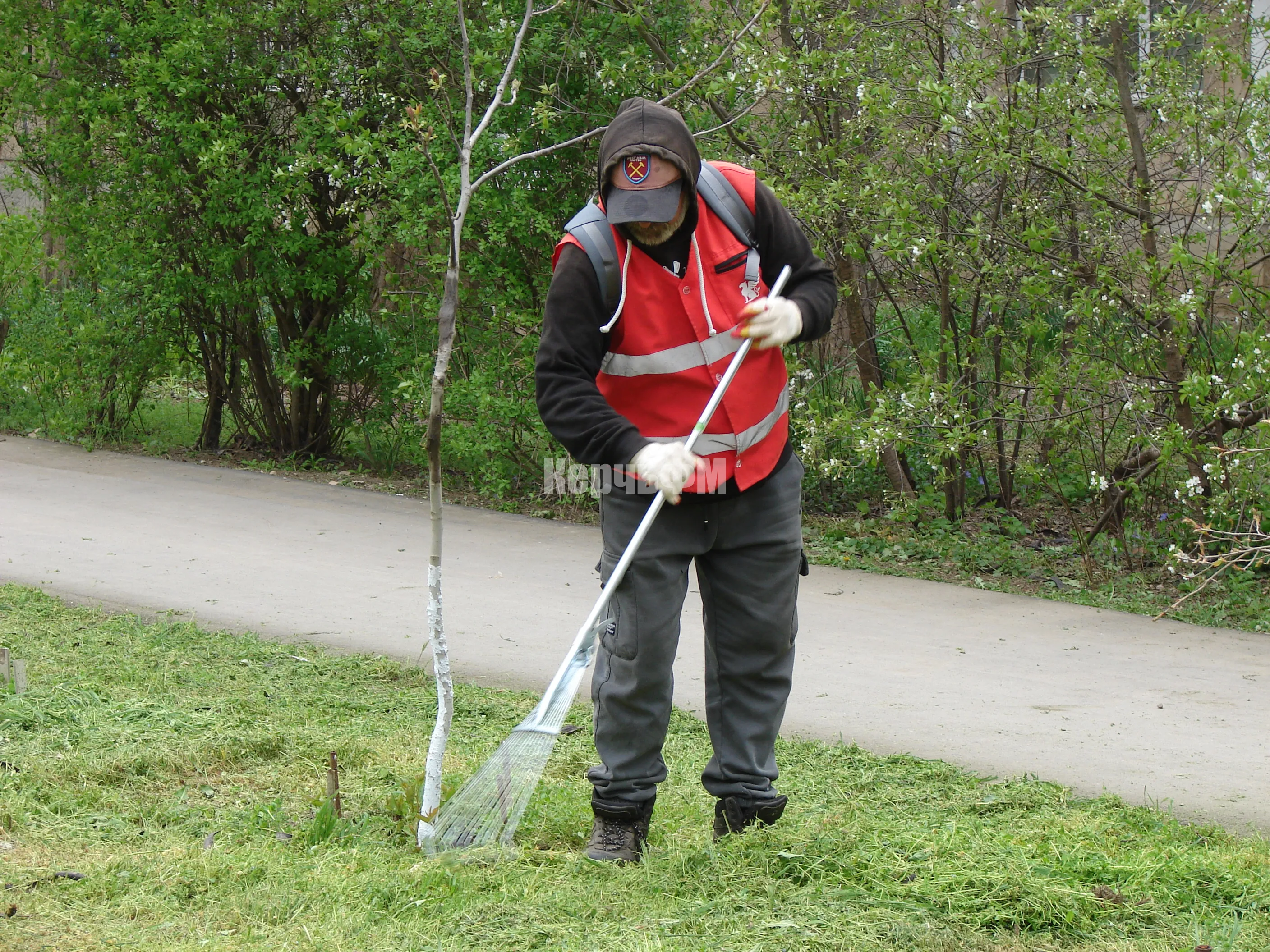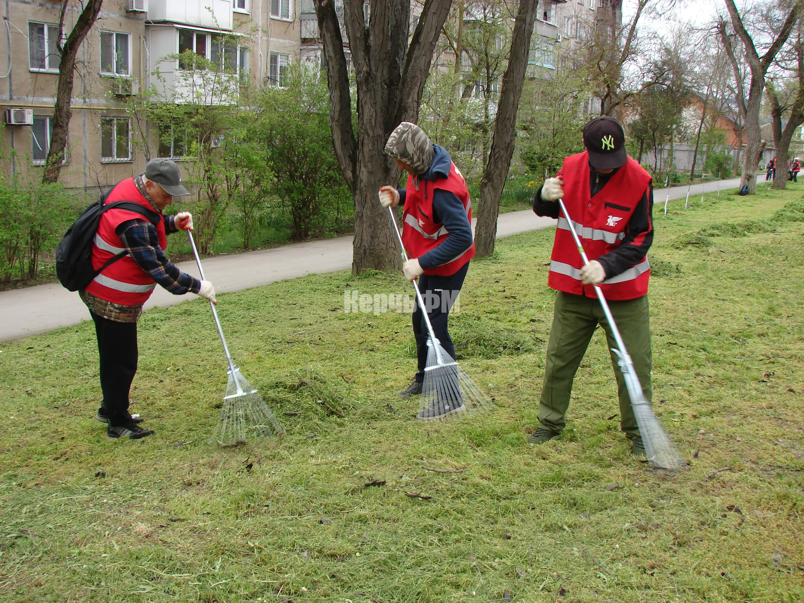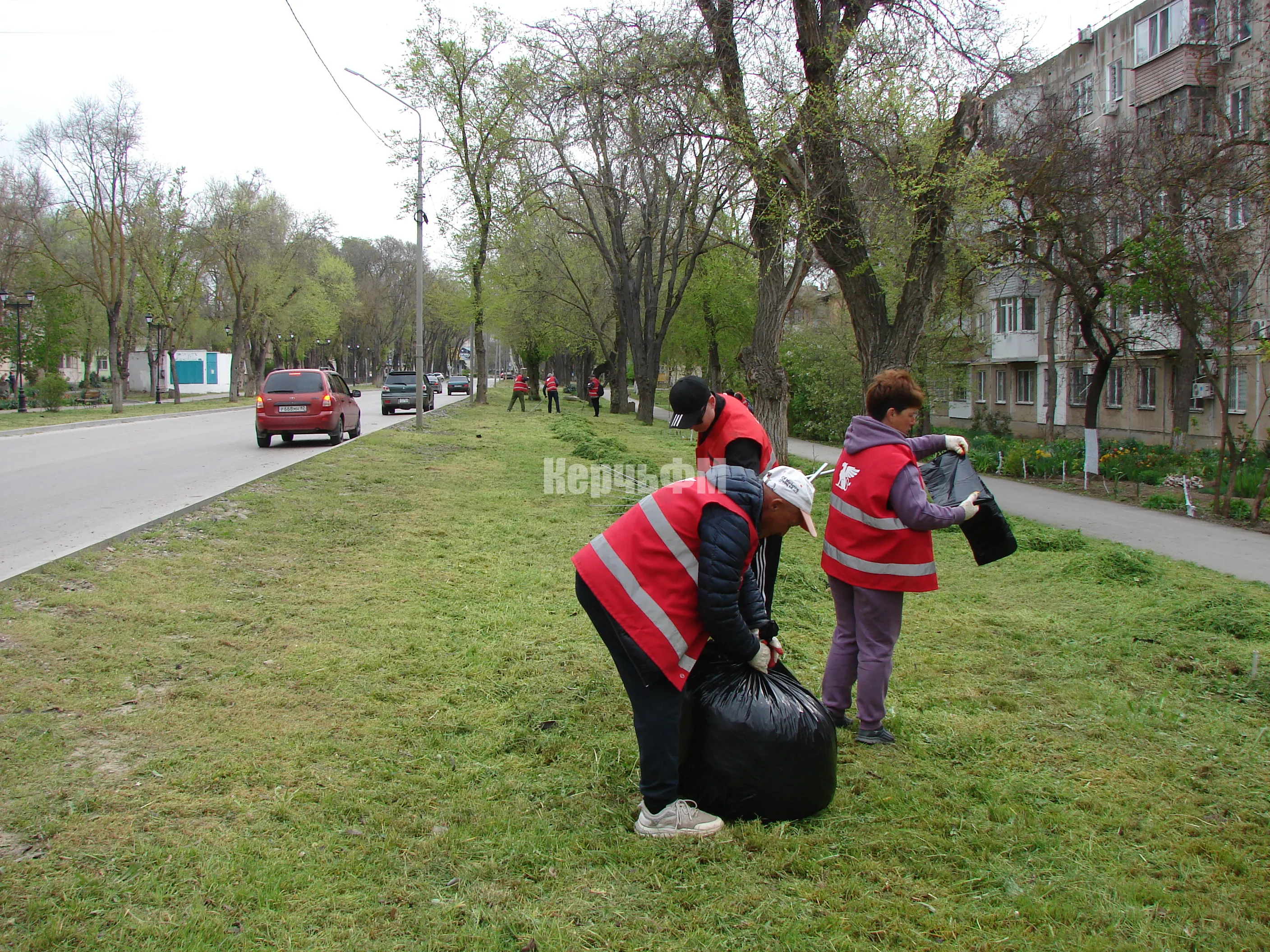 Сегодня скошенную траву бригады в красных жилетах убирали с газонов вдоль улицы Казакова и Войкова, передает КерчьФМ.