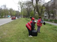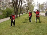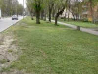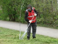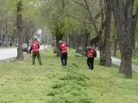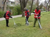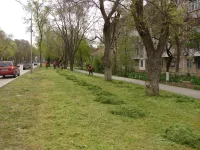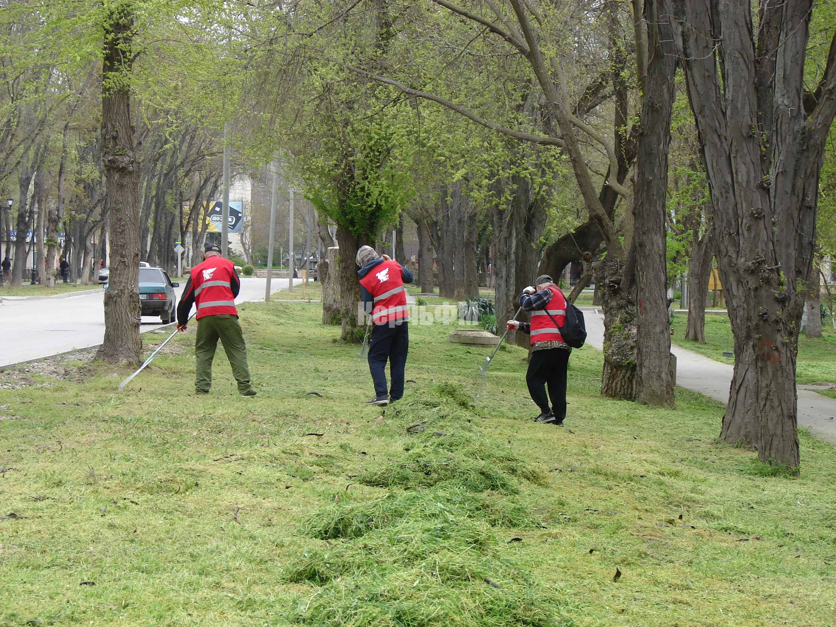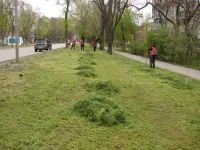 В Керчи на Казакова коммунальщики очищают газоны от скошенной травы