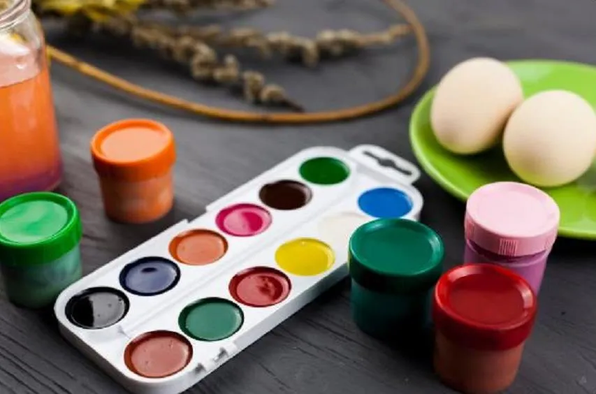 Гуашь (детская): плотная, яркая, можно рисовать пальцем или кистью. Тяжело отмывается с тканей.