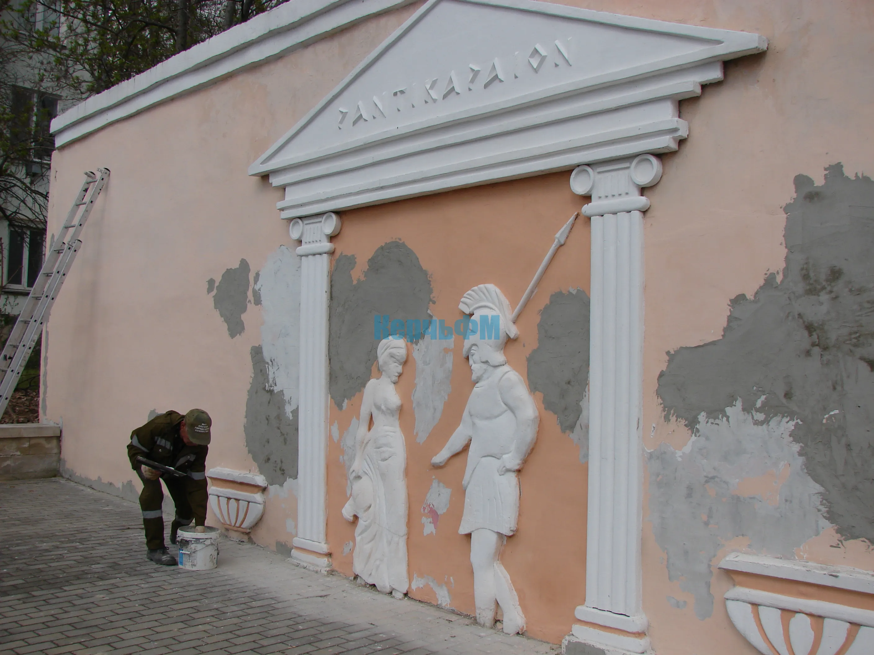 Специалисты Службы городского хозяйства ведут ремонт поверхности стены в сквере, где установлен памятник правителю Боспорского царства Митридату VI Евпатору.